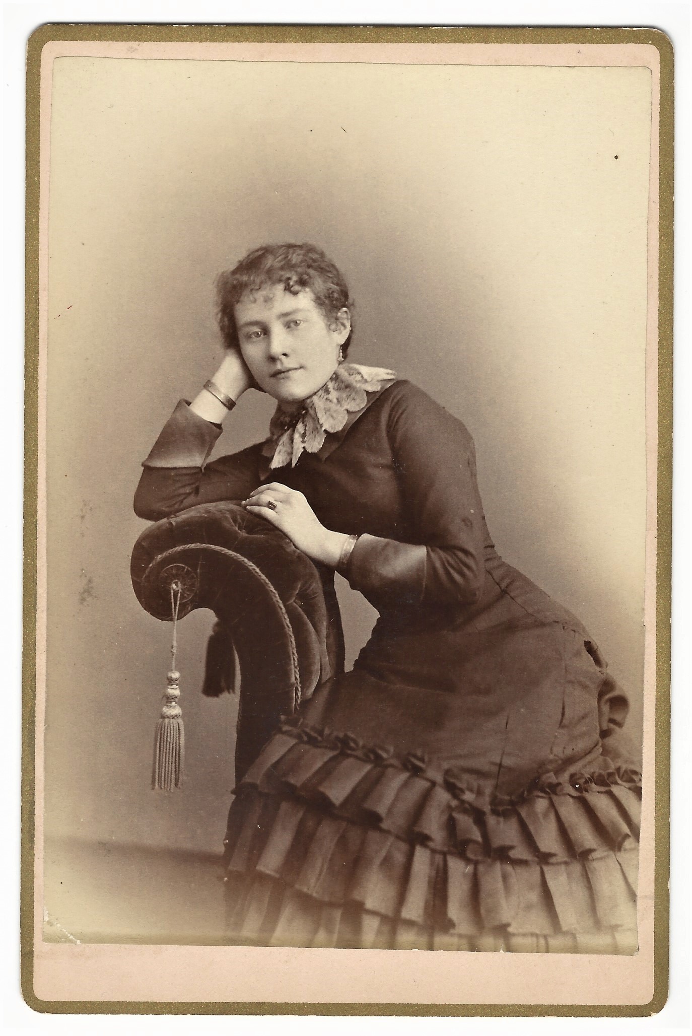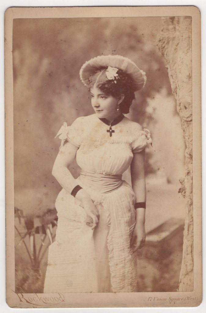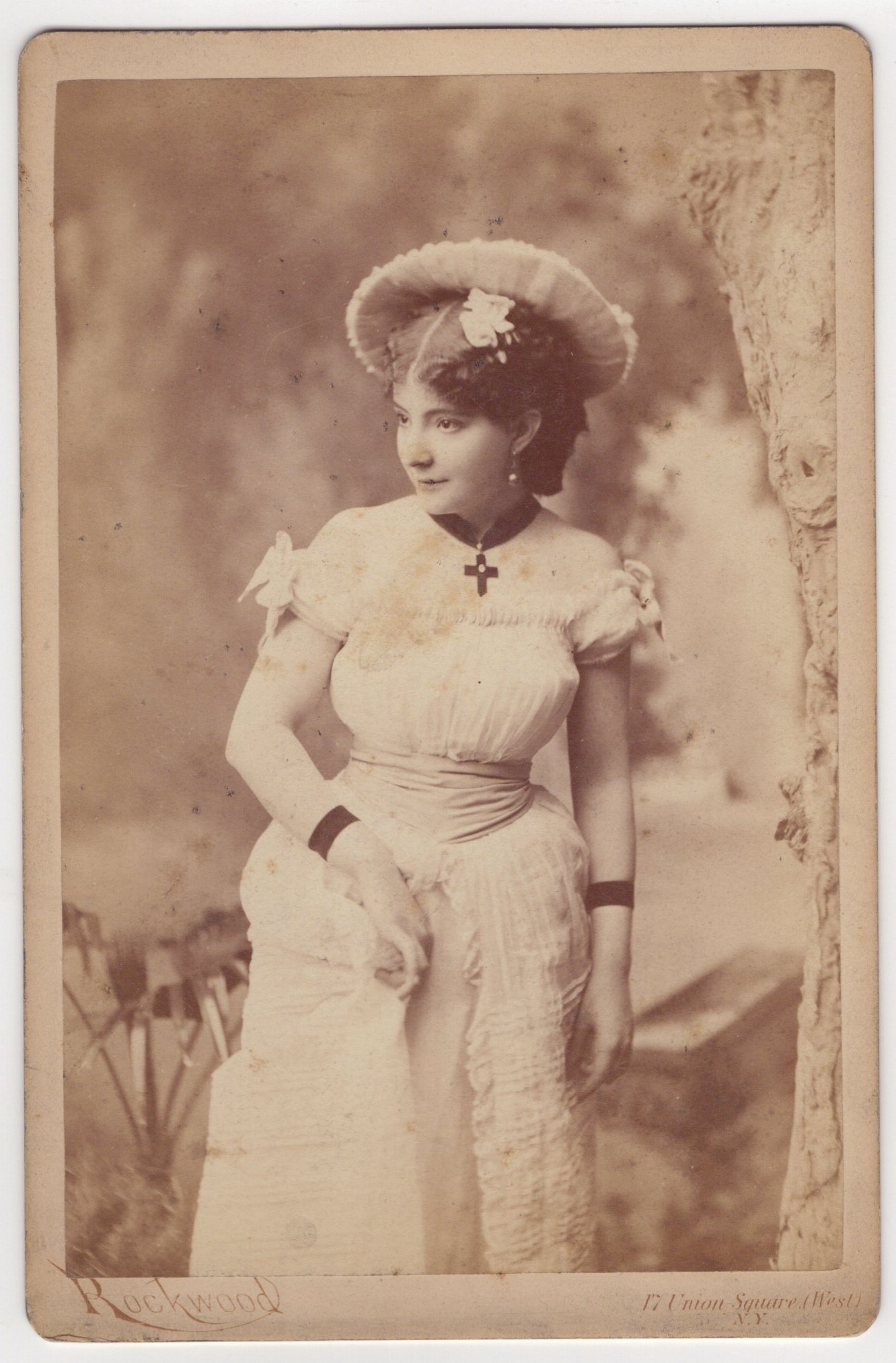 This cabinet card was photographed by George Rockwood (1882-1911) whose studio was located at 17 Union Square West in New York City. The reverse of the card identifies the subject of this portrait as Maud Harrison (c1856-1907). I have verified that this is indeed Maud Harrison. The corseted Miss Harrison is attractive and wearing a hat, a flower in her hair, and a cross. She is also wearing what appears to be wrist bands. The purpose of these bands beyond fashion, is unknown. Maud Harrison began her career at the Madison Square Theater. The IBDb reports that she appeared in five Broadway plays between 1877 and 1900. These productions include “Pink Dominos” (1877), “French Flats” (1880), and “Naughty Anthony” (1900).The New York Times reports Harrison’s death in 1907. She was found unconscious by a maid in her New York City hotel room. She died shortly after being discovered. Her cause of death was determined to be “Paralytic Stroke”. She had stopped acting in 1902 to care for her sick mother. She was in New York attempting to find a theatrical role to restart her career. For some reason, the Times reports that Miss Harrison was a Christian Scientist. This cabinet card’s photographer, George Rockwood was born in Troy, New York. He graduated from college with a PhD; reportedly either from the University of Chicago, or Columbia University. At 21 years of age, he was a newspaper reporter for the Troy Daily Times and at age 23, he was managing editor of the Troy Daily Post. He began working as a photographer in St. Louis and in 1857 opened a studio with his brother Elihu in New York City. He is credited for bringing CDV’s to America. His obituary in the Washington Post reports that Rockwood photographed more than 350,00 people. This cabinet card has foxing above Miss Harrison’s bust. The photograph is in overall good condition (see scans).