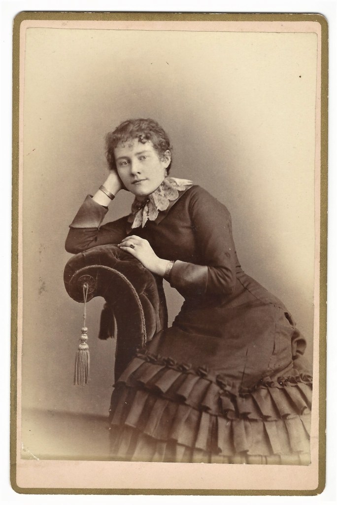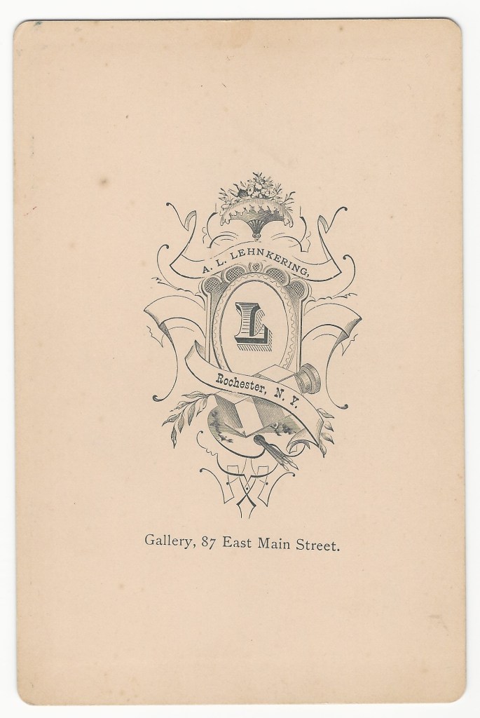 The photographer of this cabinet card is A. L. Lehnkering located at 87 East Main Street in Rochester, New York. She is wearing a gorgeous dress with rows of ruffles at the bottom. Note her tiny waist, likely courtesy of a corset. She is also wearing jewelry including a band around her wrist and a ring. She looks pensive. She is leaning on a chair with tassels. August L. Lehnkering seems to have occupied a few different addresses on East Main Street. In addition to number 87 (listed on the reverse of this image). he also operated out of 87 and 89 East Main Street, as well as 208 East Main Street. He was working out of 87 East Main in 1879, according to the Rochester Business Directory. He is mentioned in the American Journal of Photography (1891) for being awarded a photographic patent, and also in two photography journals published in 1906 for contributing to a charitable fund. This cabinet card portrait has a gold border. (SOLD)