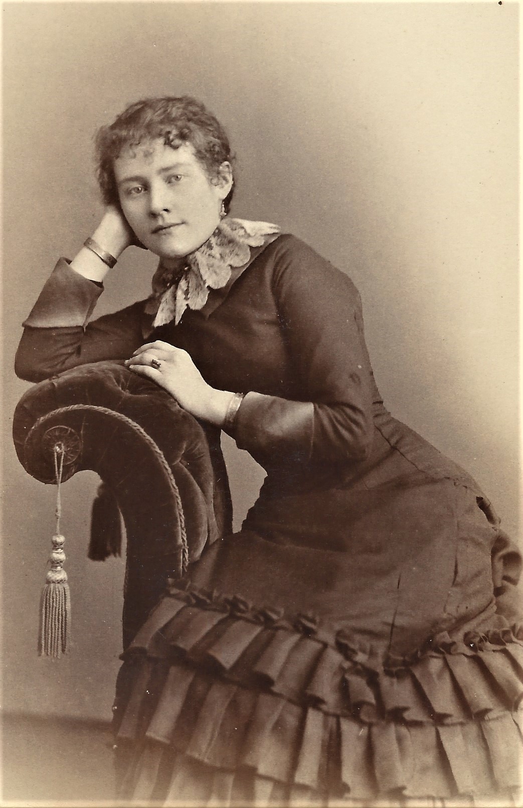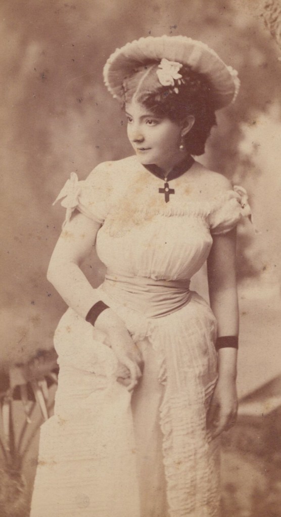 A pretty woman poses for her photograph at the studio of Hansen & Weller in Copenhagen, Denmark. The studio’s address was 28 Bredgade. The woman is playing her violin with her bow. Her hair is up and she appears to be wearing a corset , giving her a lovely figure. One of the photographers is George Emil Hansen (1833-1891). He was a pioneer Danish photographer. His father and brother were also photographers. He won photography awards in London (1862) and Berlin (1865). Hansen was the photographer of the Danish Royal Family. His photographic work spanned from 1856 through 1891. There is a gold lettered word embedded in the lower right corner of the image. The word is “emeret”; and research may illuminate the word’s meaning. “Emeret” most likely signifies that the person in the photograph had retired from a notable profession, such as acting or teaching, or was being honored post-career. It is likely a Scandinavian variant or typographical version of the Latin word “emerita” (female form of emeritus). SOLD
