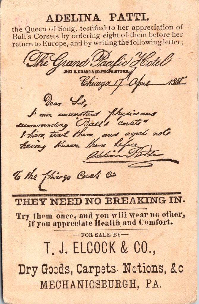 This item is a vintage trade card advertising corsets for the Chicago Corset Company. The card dates back to the 1880’s. The wasp waisted women seen in a number of the photographs of the cabinet card era, didn’t get that way from going to Jenny Craig and the gym. Their secret weapon was wearing a corset. This trade card utilizes a “celebrity spokesperson”. Adelina Patti, a famous opera singer, sings the praise of Ball’s Corsets which were manufactured by the Chicago Corset Company of Aurora, Illinois. She ordered eight corsets and testified that she wished that she had known about them sooner. The company advertising on the card brags that “they need no breaking in” and that they provide “health and comfort”. This particular trade card is also advertising the T. J. Elcock & Company which was a Dry Goods, Carpet, and Notions store in Mechanicsburgh, Pennsylvania. Here is a little information about the Chicago Corset Company, The business is cited in Robin Shepard’s “The Best Breweries and Brewpubs of Illinois (2003). The author writes that in the late 1800’s and early 1900’s Aurora was considered the corset capitol of the world. There were at least three corset companies operating their factories there and one of the largest was the Chicago Corset Company. In fact, I read elsewhere, that the company was the second largest corset company in the world. At one point, the business employed 600 people and produced 2 million corsets a year. The word “corset” began to be used in the English language in about 1828. “The Ladies Magazine” described it as a “quilted waistcoat”. The primary reason for using corsets was to slim the body and help it conform to a fashionable silhouette. Generally speaking, the corset reduces the waist and exaggerates the bust and hips. Apparently there were “overbust corsets” and “underbust corsets”. Sometimes, corsets were used for medical or for fetish purposes. I’ll refrain from elaborating about the medical and fetish purposes and leave detailed explanation to your imagination. The corset company’s spokesperson on this trade card is Adelina Patti (1843-1919). She was a celebrated 19th century opera singer who earned a great deal of money for her performances at the height of her career. She sang in both Europe and America and is probably one of the most famous sopranos in history. She was born in Madrid. Her father was tenor Salvatore Pattie and her mother was soprano Caterina Barilli. Her parents were Italian and she grew up in the Bronx, New York. She sang professionally from childhood. At sixteen years of age, she made her operatic debut at the Academy of Music in New York City. At age eighteen she began performing in Europe. She later performed “Home Sweet Home” for President Lincoln and his wife shortly after the death of their son, Willie. The bereaved parents requested an encore. She was associated with the song for her entire career. In her prime, Adelina Patti demanded to be paid five thousand dollars a night. She asked to be paid in gold, prior to each performance. She demanded top billing and that her name be in bigger font than others in the company. She also demanded that she not be obligated to attend rehearsals. Did someone say, DIVA? It was reported that she trained her parrot to say “Cash, Cash”. Be sure to look below to see some interesting images pertaining to corsets as well as an image of Miss Patti. (SOLD)