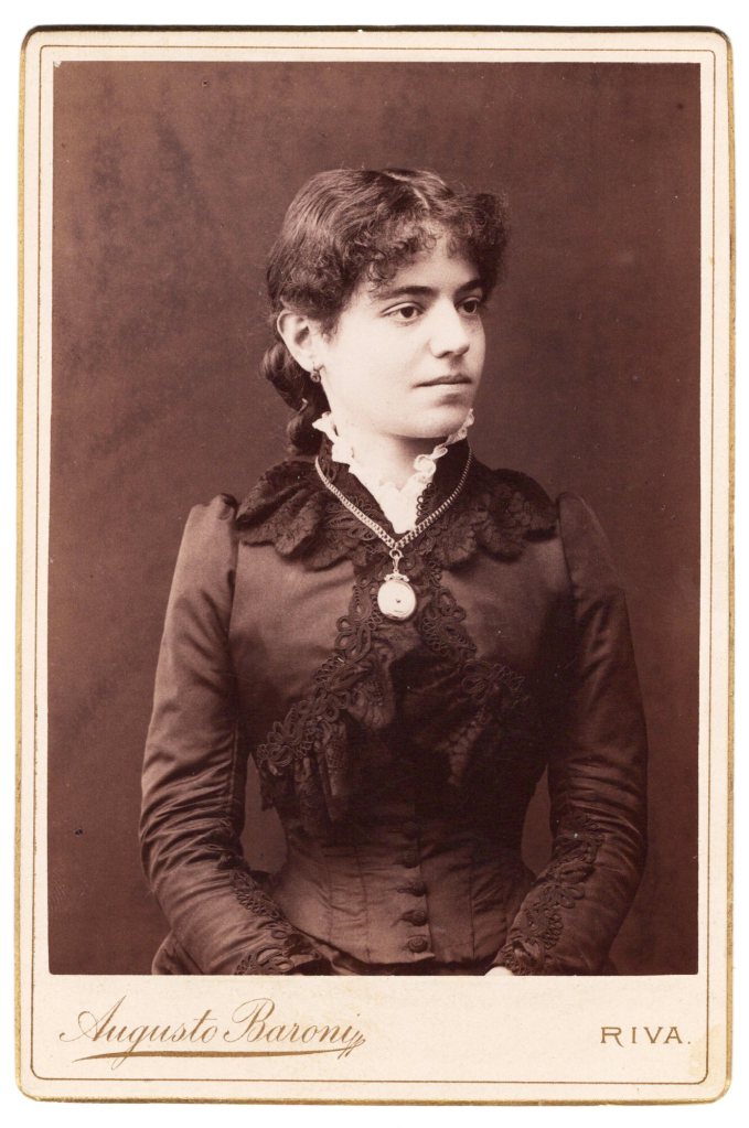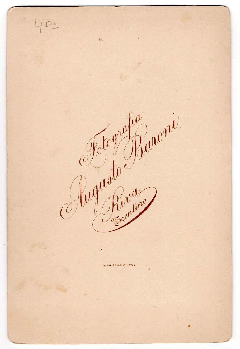 A pretty young woman poses for her cabinet card portrait at the studio of Augusto Baroni in Riva, Italy. The town of Riva is located in northern Italy in the province of Trentino. The town is formally known as Riva del Garda. The subject of this photograph is wearing a heavy chain necklace with a locket. She is wearing a beautiful dress. Her very thin waist is likely the result of a corset. This cabinet card photograph is in very good condition (see scans).