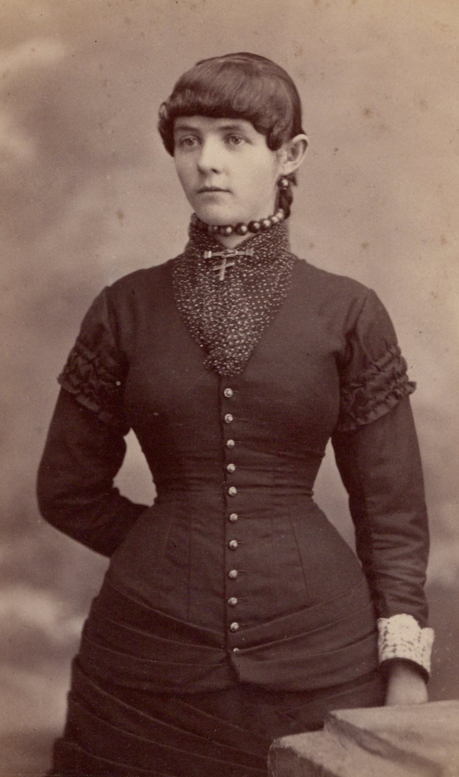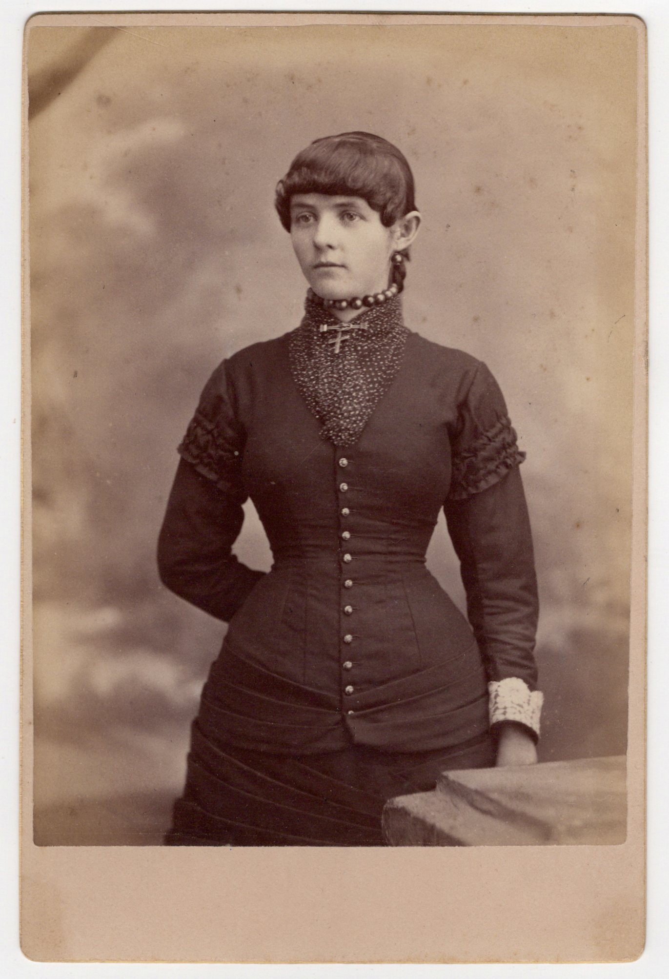 This Cabinet Card presents an attractive woman in a beautiful dress. She is wearing a “choker” necklace, a cross, and earrings. Note her somewhat unusual hairstyle and that she is wearing bangs. In addition, the woman in this portrait achieved an hour-glass type figure with an assist from a corset. A corset is a garment that was worn to mold a woman’s torso into a desired shape. Typically, corsets reduced the size of woman’s waist and exaggerated the size of their bust and hips. SOLD