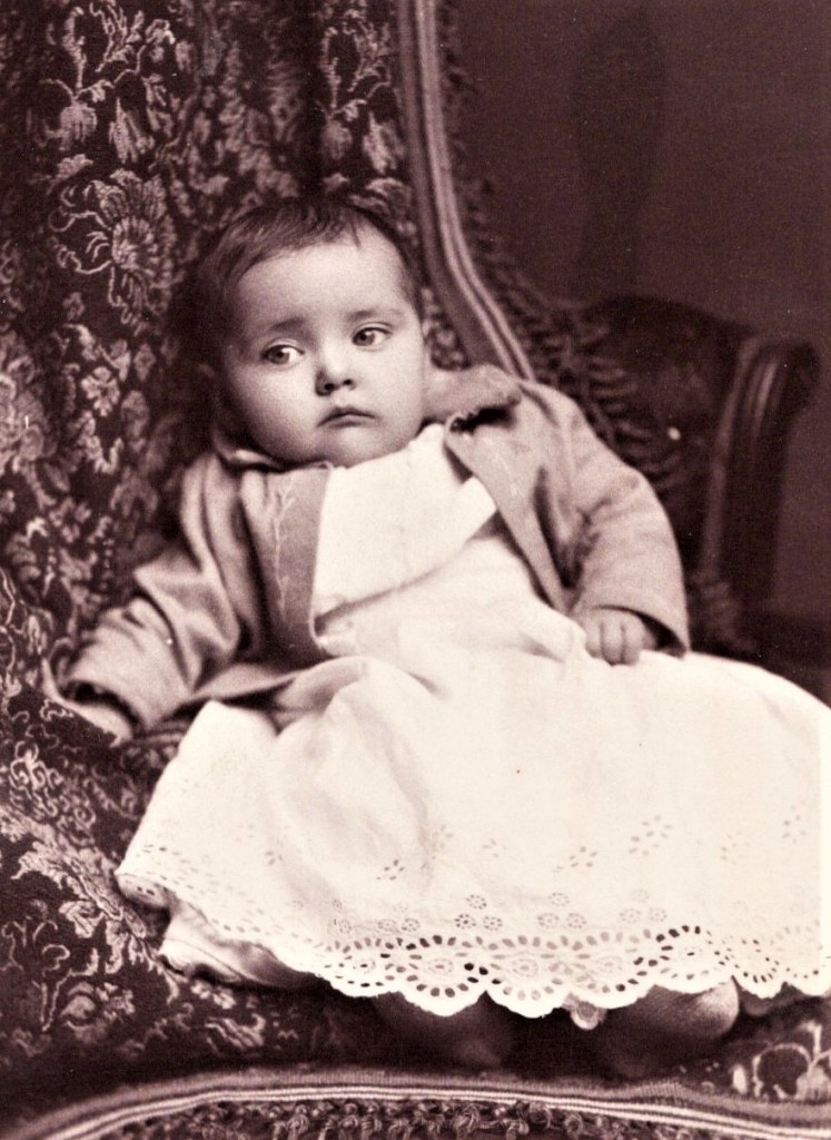 This cabinet card photograph features a very cute baby wearing a gown and sweater. She has beautiful big eyes According to an inscription on the reverse of the image, the baby is named Atalie Jean Crum and she was five months and two days old, at the time the photograph was taken. Atalie Crum can be found on both the 1900 and 1910 U.S. census. She was born in 1890 and resided in Penn, Illinois. She lived with her parents, Brooke W. Crum, and Laura V. Crum. Both of her parents were born in Pennsylvania and her father was a farmer. The 1910 census reveals that at age twenty, Atalie was employed as a school teacher. A 1913 publication from the Illinois Office of Public Instruction, states that Atalie taught school in Stark County, Illinois (District 53). At an unknown age, she married Claude Sterling, a local farmer. An obituary in the Peoria Star (1936), reports the death of John Wesley Crandell. He died at the age of 78 in Castleton, Illinois. He was his community’s last surviving civil war veteran. A male quartet sang at the funeral and they were accompanied by a Mrs Atalie Sterling at the piano. This is likely the Atalie Sterling in the photograph. Atalie lived a long life, dying in 1969 at age eighty in Wyoming, Illinois. The photographer of this cabinet card is difficult to identify with any certainty. There was a photographer named W. H. Farley who operated in Crete and Gibson Illinois in the 1880’s. A photographer named A. Farley also had a studio in Illinois. Research uncovered another cabinet card with the same Farley logo as this cabinet card. The card was from a studio located in Tampico, Illinois. Tampico is the likely place that Atalie Crum was photographed. This cabinet card portrait is in very good condition (see scans).