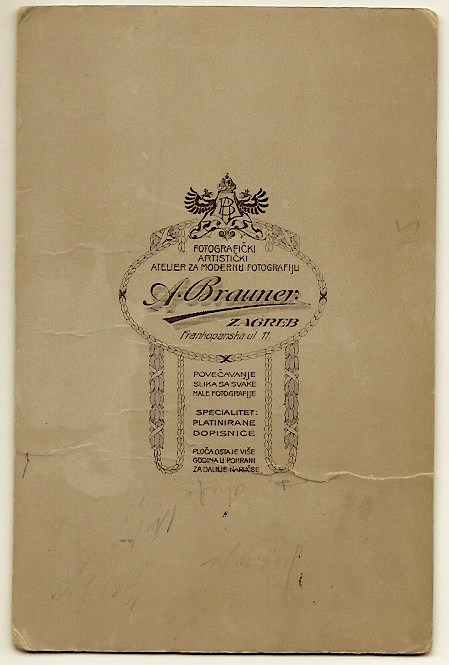 This cabinet card portrait features a very pretty young woman. Her hat compliments her appearance. She is likely in her teenage years. The photograph is a bit unusual in that the cabinet card provides a close-up view horizontally rather than the typical vertical perspective. The photographer of this image is A. Brauner, who operated a studio in Zagreb, Croatia. In terms of present day geography, Zagreb is the capital and the largest city in Croatia. (SOLD)