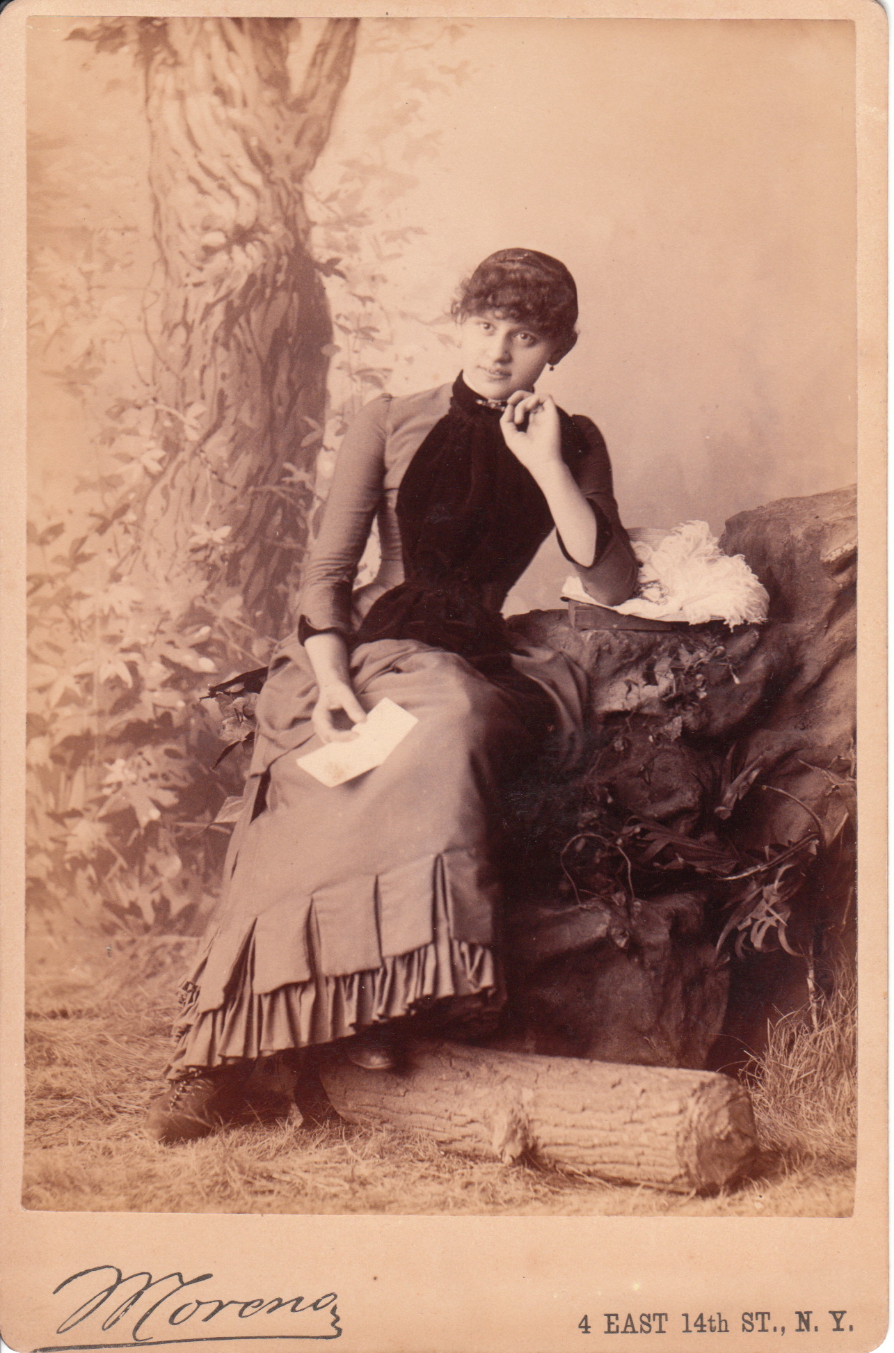 MORENOA pretty young woman sits on a faux rock as she poses at the Moreno studio in New York City. She is holding what appears to be an envelope in her hand but at first glance looks like bank check. This fashionable subject is very thin waisted and present herself in what the photographs previous owner called “a fetching pose”.  Antonio E. Moreno was a Cuban painter and graphic artist who became a photographer after seeing the success of his New York based countryman, Jose Maria Mora (see category “Photographer: Mora”). In 1881, Moreno took over a failing New York City photographic studio. The business end of the studio was run by his co-director, Jose Lopez. Moreno developed the business into a great success due to his great talent as a photographer, developer and innovator. He became noted in photographic circles and received much acclaim from his participation in photographic expositions. He surrounded himself with talented co-workers. Much of his staff came from Mexico. Spanish cameraman Antonio Urda was considered to be excellent at his craft but was a fiery man who eventually committed suicide by drinking development fluid after failing to murder printer Domingo Costello. After this incident, Moreno preferred to hire English speaking Europeans to work at his studio. One of his hires was printer Nahum Lubosh whom he snared from celebrated photographer B. J. Falk (see category “Photographer: Falk”).  Another employee, cameraman A. L. Simpson pioneered the use of slides utilized in theater sing-alongs. In 1890 Moreno partnered with the Taber Art Company in publishing photographs of beautiful female models in what has been described as “genre scenes and allegories”. The photographs were well posed, precisely lit and very tasteful. Moreno’s gallery was in business for a quarter of a century and was a center for performing arts portraiture. One wonders if the subject of this cabinet card portrait was in fact a theater actress. To view other photographs by Moreno, click on the category “Photographer: Moreno”.