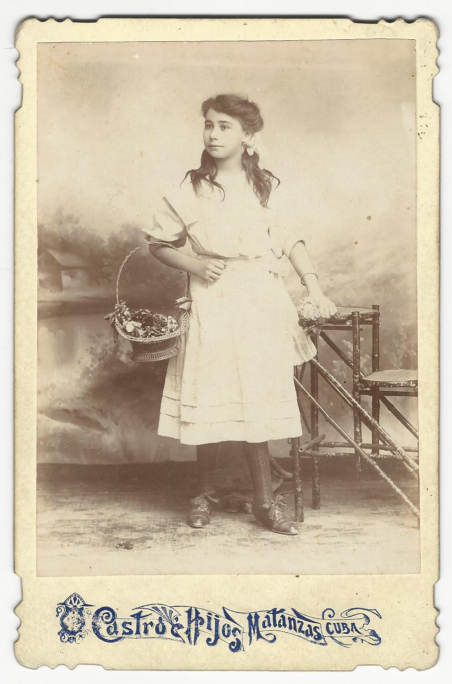 An adolescent girl, holding a basket of flowers, poses for her portrait at Castro Brothers studio in Matanzas, Cuba. The girl is wearing a bracelet and clutches flowers in her left hand. Interestingly, the Cabinet Card Gallery has a cabinet card in its collection taken by a Matanzas photographer named C. Ruiz de Castro. It is unknown whether C. Ruiz de Castro is one of the Castro brothers who created the cabinet card above. To view other Cuban cabinet cards, click on the category “Cuba”.    SOLD