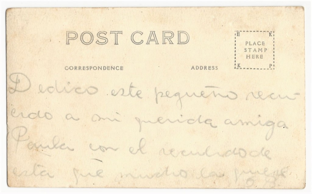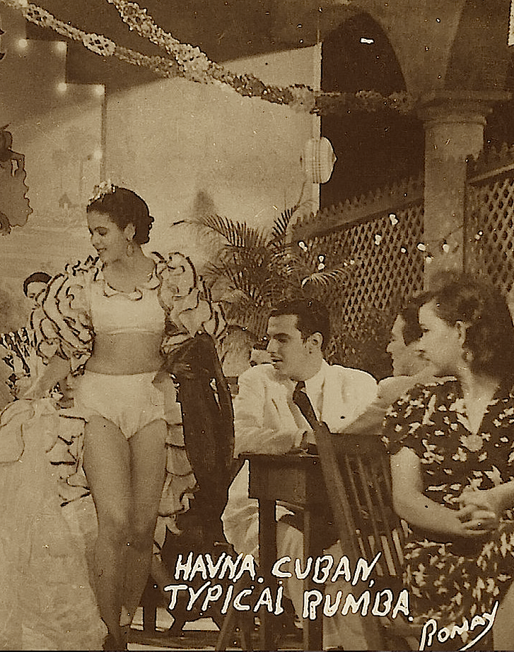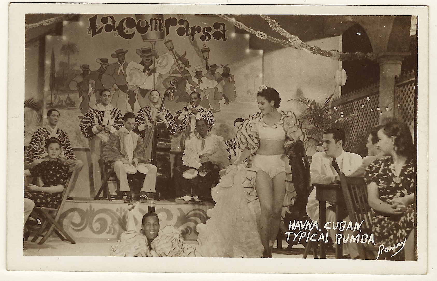 This vintage real photo postcard captures a glimpse of latin social and dance history. This is a photograph of a Havana, Cuba, nightclub in which the patrons participate in a festival of music and dance. The featured dance is the rumba. I have seen two other postcards in this “Typical Rumba” series. This postcard is by far the nicest of the three. The photographer has signed the photo with the name “Ronay”. A sign on the wall states “La Comparsa”. A comparsa is a group of dancers, singers, and musicians that perform in carnival and other festivities in Latin America and Spain. The most well known comparsas are the ones that take part in the “Carnival of Santiago de Cuba”. Does the United States have Comparsas? The most similar carnival held in the United States, according to some writers, is Mardi Gras in New Orleans. Cuban comparsas originate in the eastern part of the island, specifically the city of Santiago de Cuba. The singers, musicians and dancers form the “conga”, the ensemble that performs the canrival music, Havana has it’s own version of carnival. Each city has specific comparsas that tend to perform there. The term “rumba” refers to a style of music and dance. The rumba was exported by Cuba to North America, much like it’s replacement, salsa. The history of the rumba, as well as Comparsas, is much too complex and detailed to be adequately presented in this description. This postcard is from circa 1950 and it is in excellent condition. (see scans).  (SOLD)