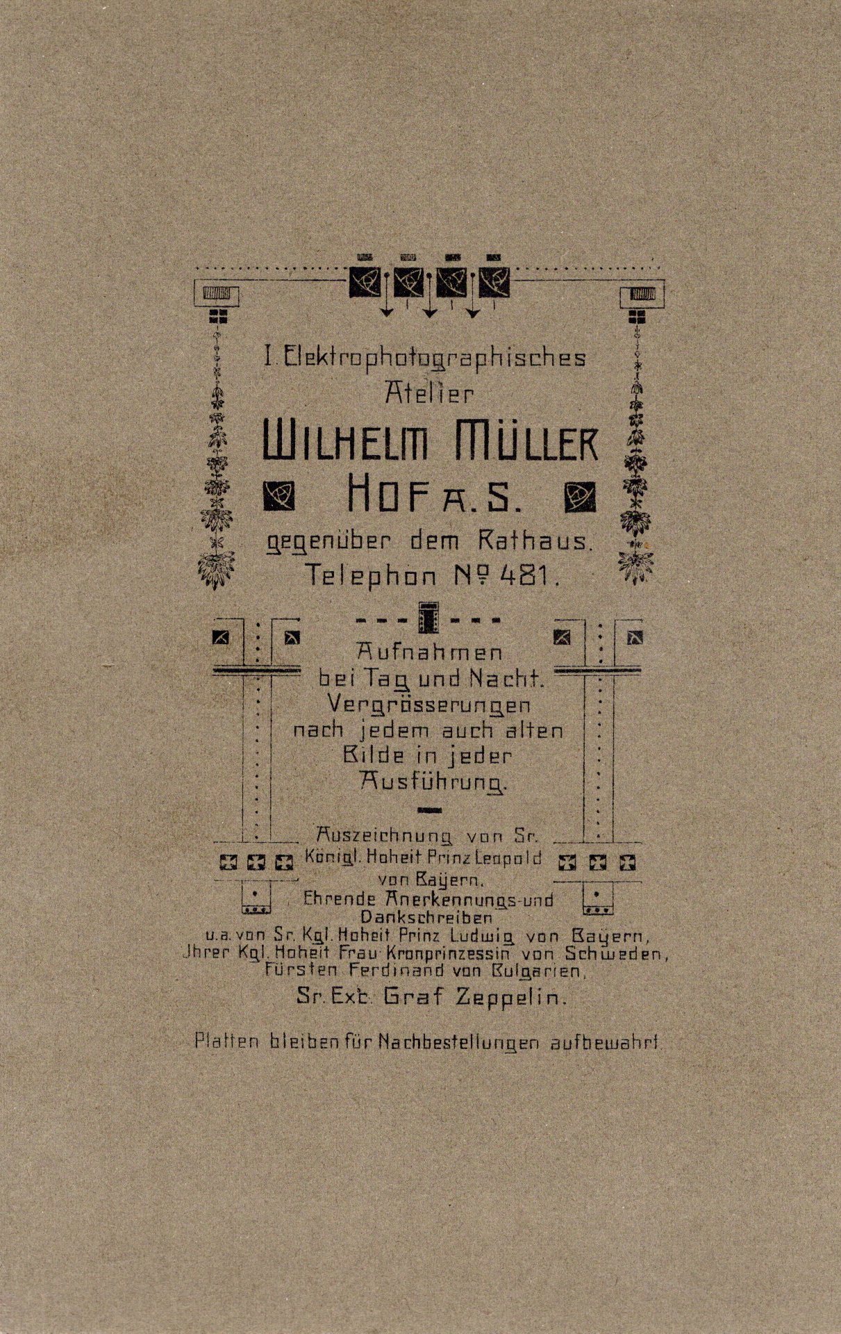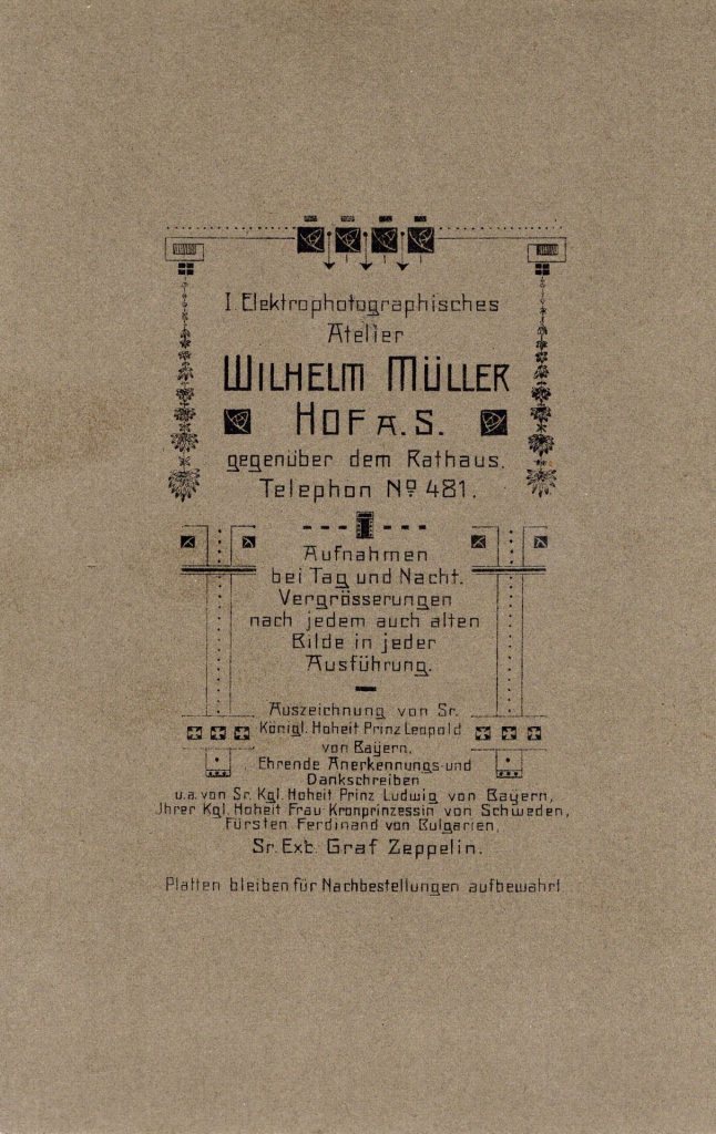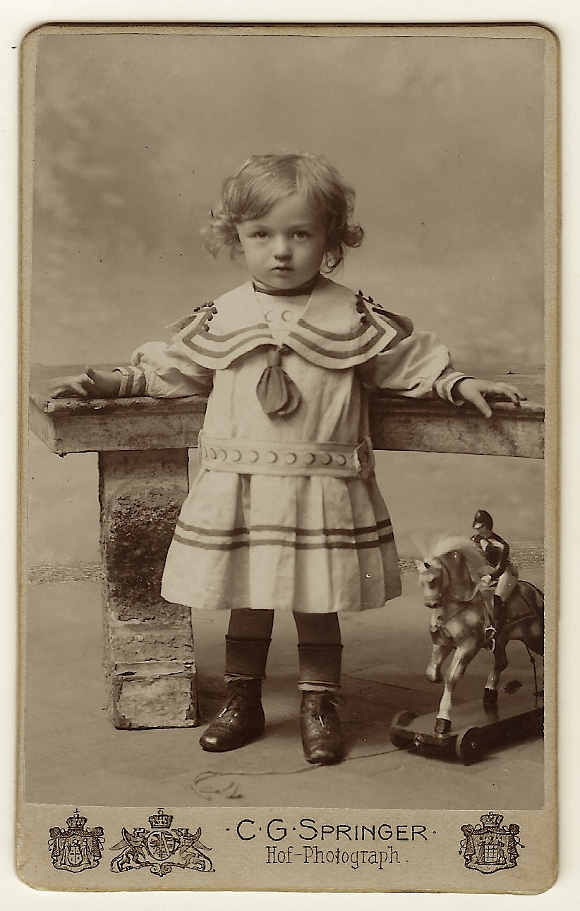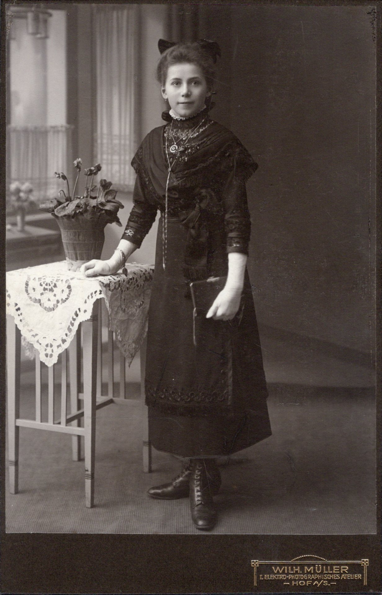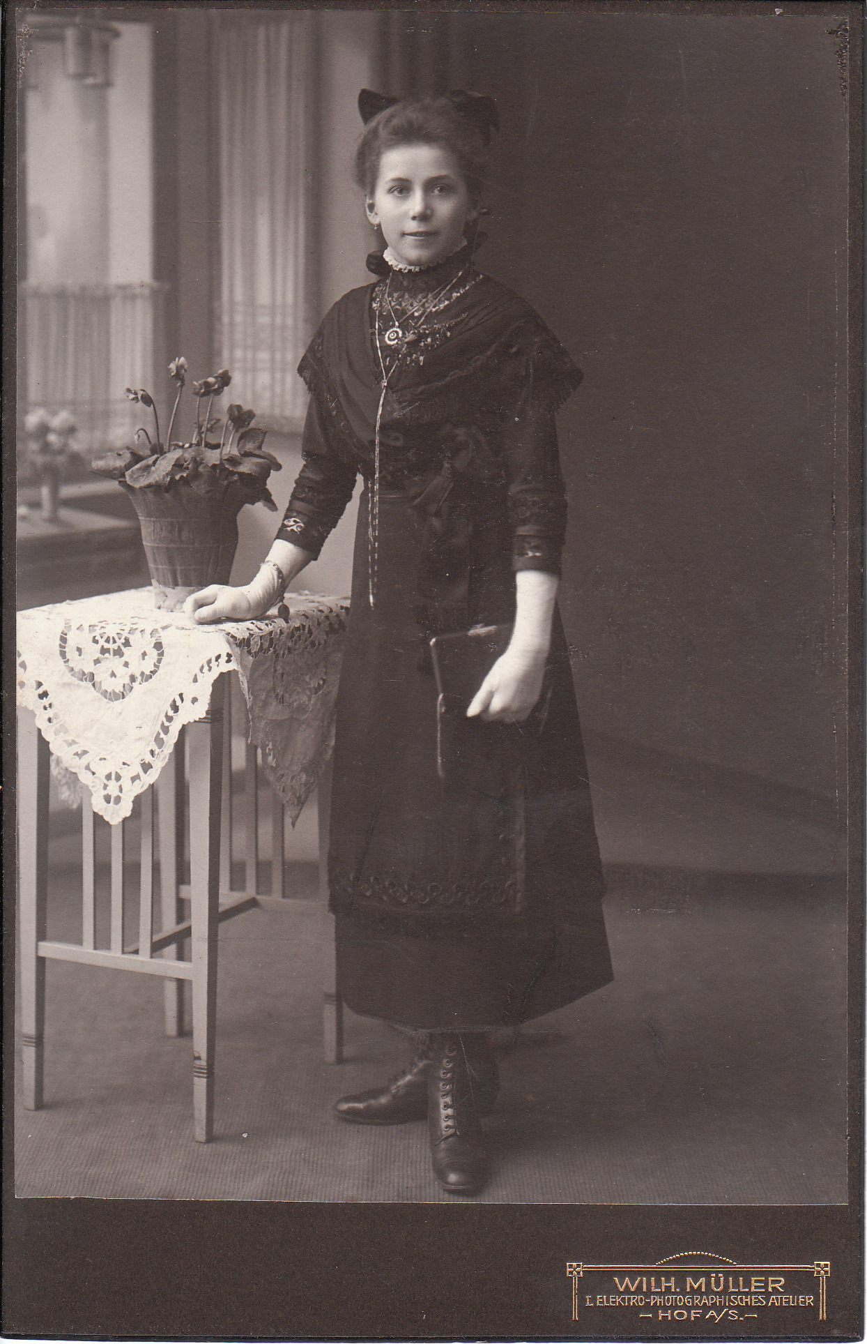 A pretty girl poses for her portrait at the Wilhelm Muller studio in Hof, Germany. Hof is a city in Bavaria, Germany. The city is located near the border with Czechoslovakia. This photograph may be a confirmation or communion picture. She appears to be a teenager and is very nicely dressed. She is wearing two necklaces, earrings, and a bracelet with a charm. She is also wearing a bow in her hair. She is holding something in her left hand, and what it is, isn’t exactly clear. The object appears to be a book or a purse. Perhaps a cabinet card gallery visitor can identify what it is that she is holding. One thing that is certain is that the girl in this photograph has a wonderful smile. This cabinet card portrait is in very good condition (see scans).