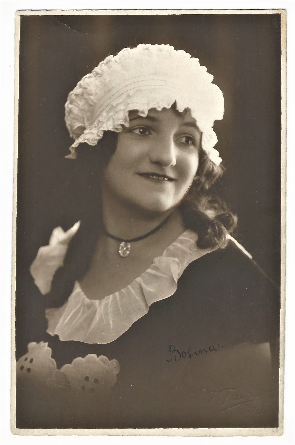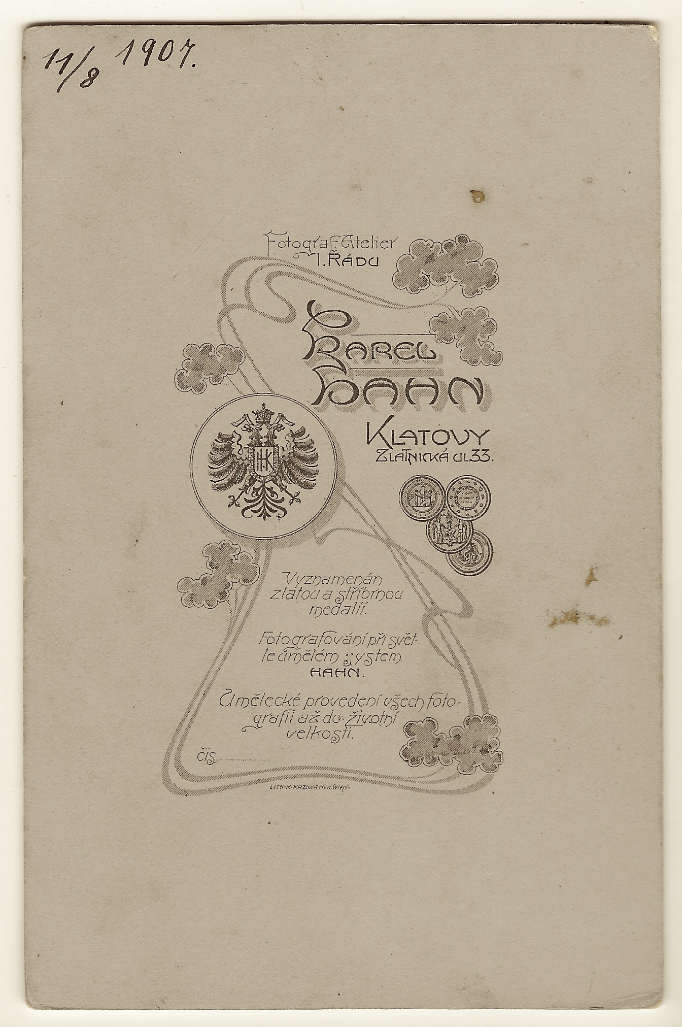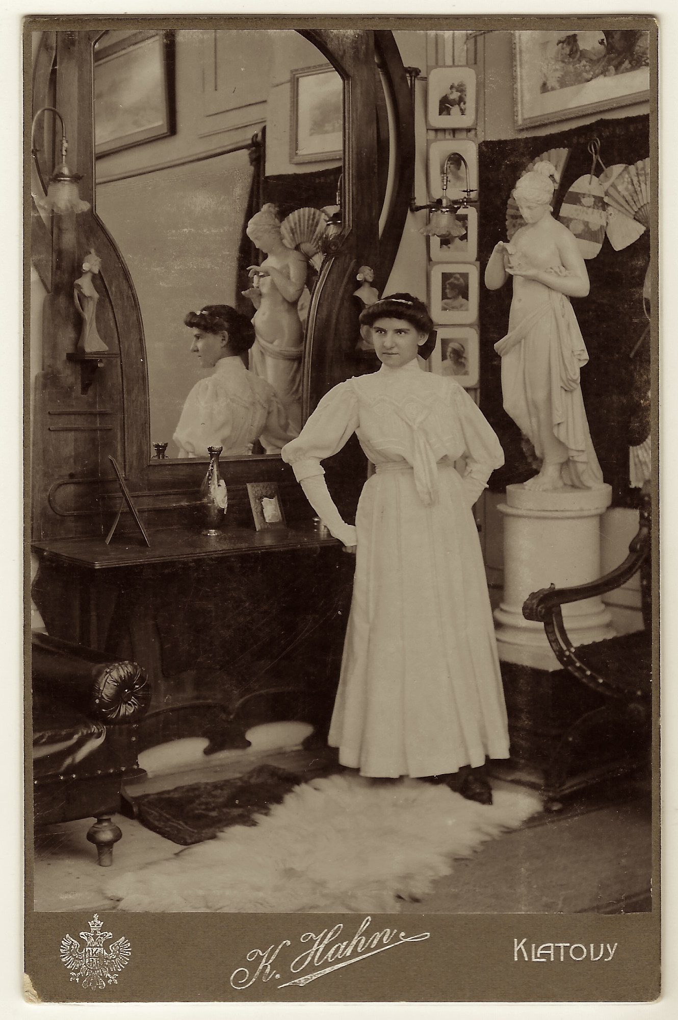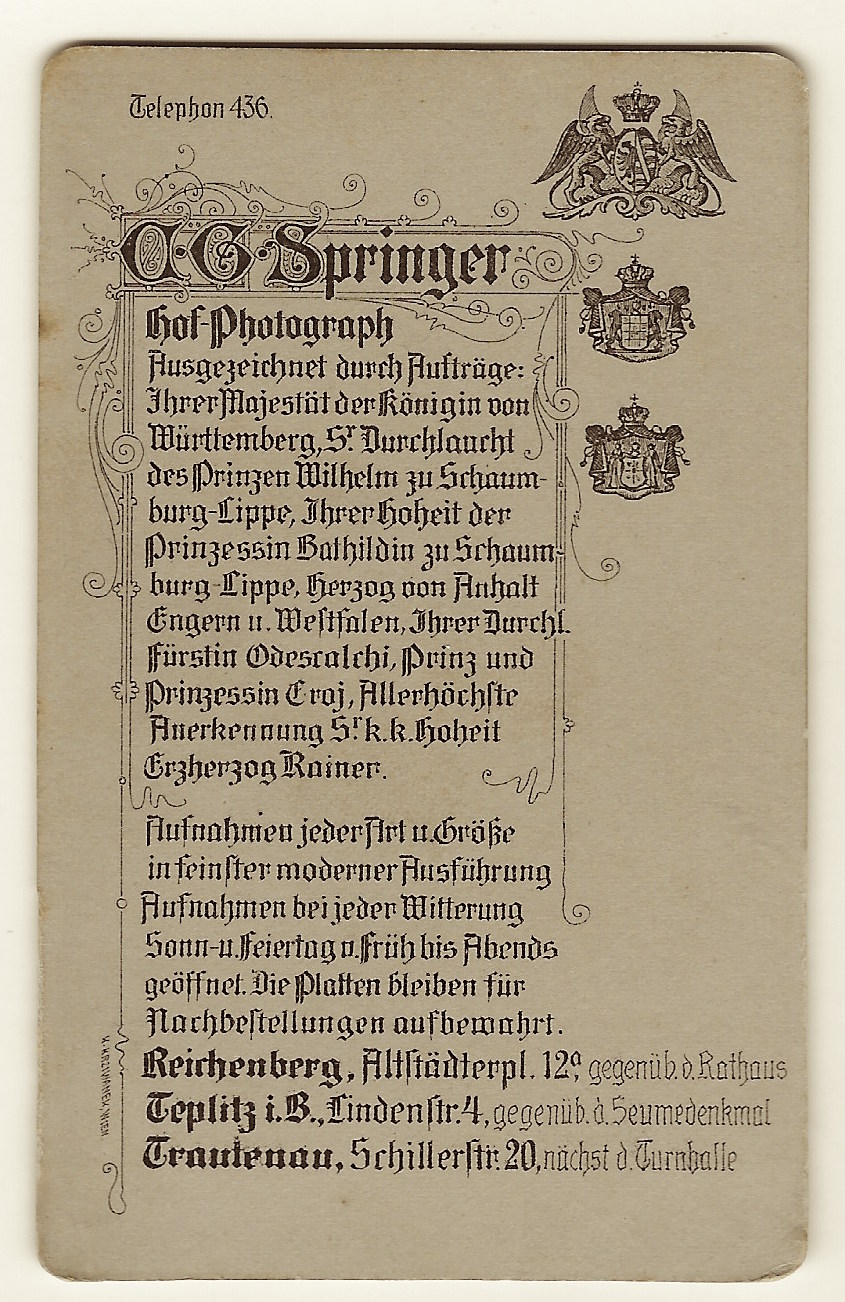 A pretty girl poses for her portrait at the Wilhelm Muller studio in Hof, Germany. Hof is a city in Bavaria, Germany. The city is located near the border with Czechoslovakia. This photograph may be a confirmation or communion picture. She appears to be a teenager and is very nicely dressed. She is wearing two necklaces, earrings, and a bracelet with a charm. She is also wearing a bow in her hair. She is holding something in her left hand, and what it is, isn’t exactly clear. The object appears to be a book or a purse. Perhaps a cabinet card gallery visitor can identify what it is that she is holding. One thing that is certain is that the girl in this photograph has a wonderful smile. This cabinet card portrait is in very good condition (see scans).