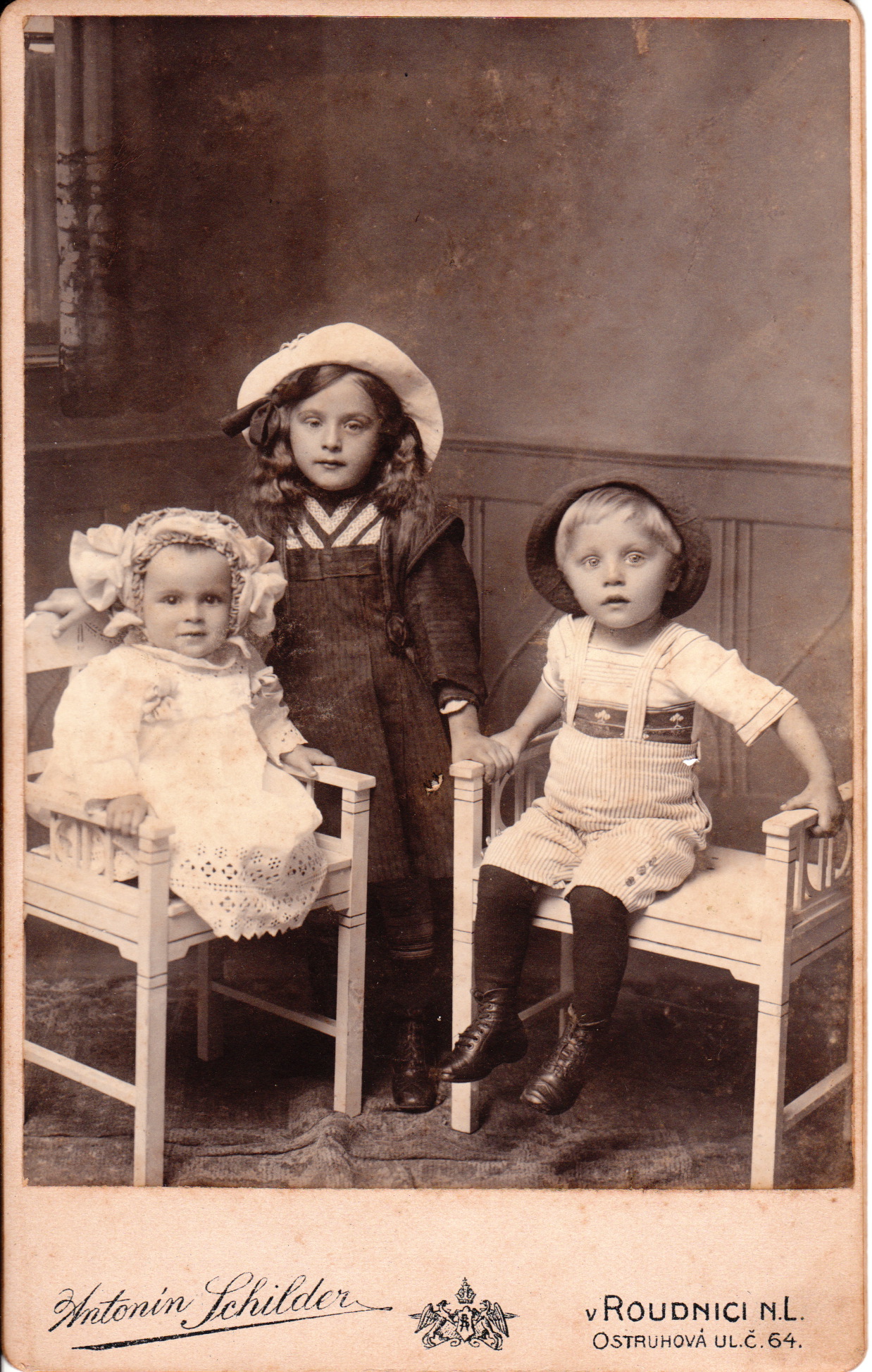The three siblings posing in this vintage real postcard portrait are beautiful children. The kids are beautifully dressed. The boys are wearing sailor type caps. The younger brother can not contain a smile. Big sister appears to be in her teenage years. The photograph was taken at the American Photo studio in Prague, Czechoslovakia. This image has terrific clarity and is in excellent condition (see scans).