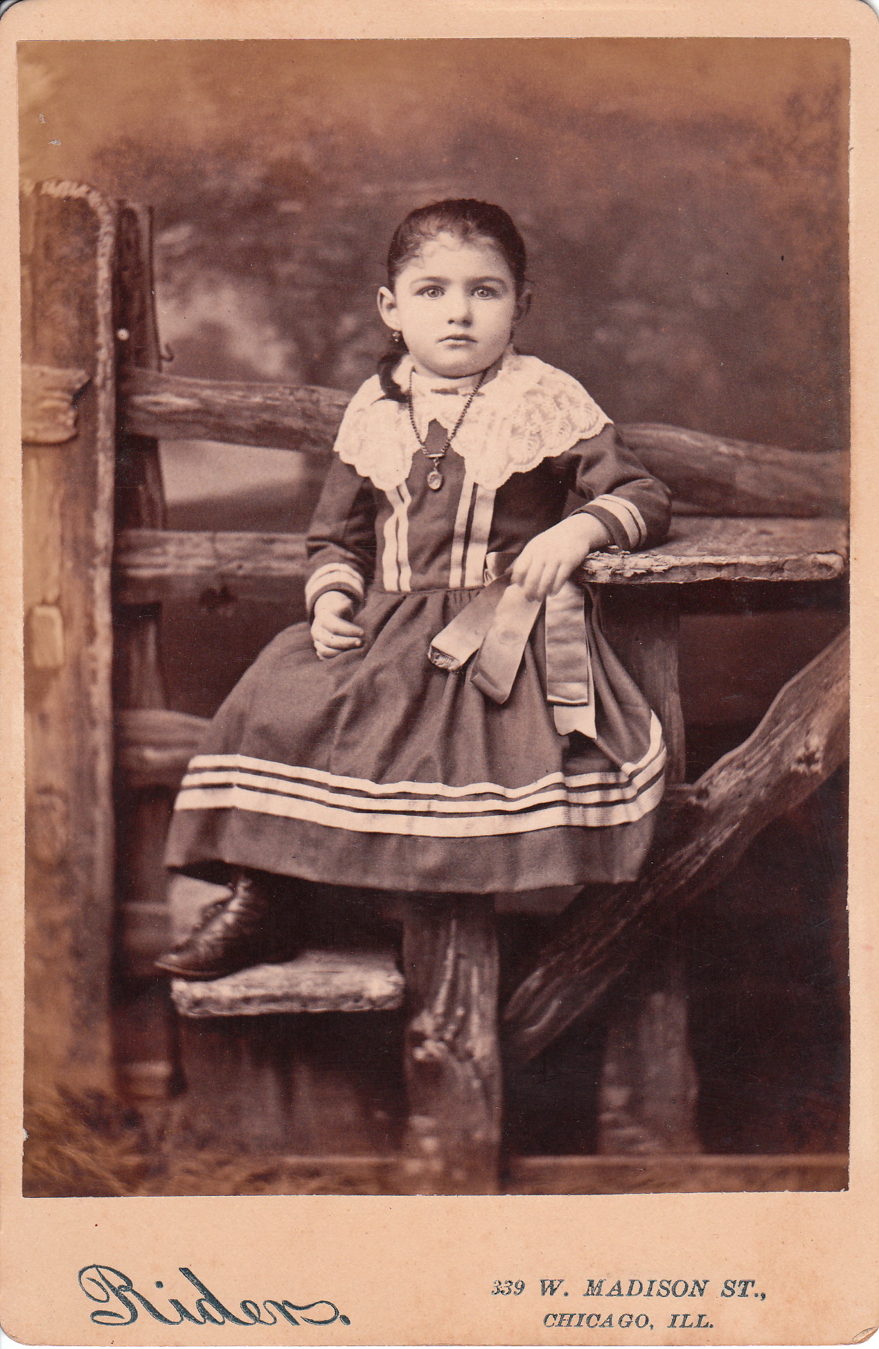 A cute little girl poses for her portrait at the studio of Briggs L. Rider, of Chicago, Illinois. The child is wearing a very cute outfit that includes lace and ribbons. The photographer, Rider, was active in Tipton, Iowa (1855), Des Moines, Iowa (1856-1860), and Chicago, Illinois (1864-1896?). During part of his tenure in Chicago, Rider was partners with photographer, Joseph Gehrig. Rider was a daguerreoist and cabinet card photographer. He also copied paintings, drawings and daguerreotypes; and taught daguerreotype art. The address listed on this cabinet card indicates that it was produced sometime between 1878 and 1890.