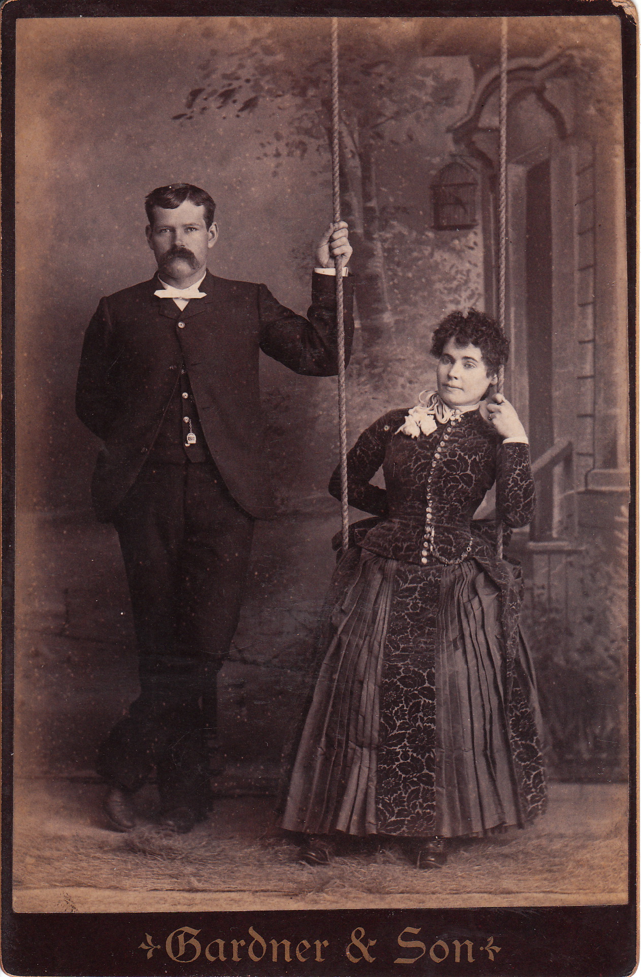 This cabinet card features a handsome couple that likes to swing. The husband is a hunk and the wife is pretty. Both are dressed well. Wait a minute! Where is your mind taking you? I’m not referring to that kind of swinging. I’m talking about playground type swinging, like kids do. The photographer of this image is G. W. Gardner & Son: “Photographic And Portrait Artists”. The Gardner studio was located in Napoleon, Ohio. Apparently, many people liked to swing during the cabinet card era and you can see a number of photographs of swingers by clicking on Cabinet Card Gallery’s category “Swing”. George W. Gardner was born about 1829 in Cayuga County, New York. He began as a daguerreotype artist in Seneca County, Ohio in about 1850. He moved to Napoleon in 1865 and operated a studio from about 1870 until about 1900. He was assisted by his son George W. from about 1880 through about 1900. (George W. following in his fathers footsteps is reminiscent of another George W. following in his father’s footsteps slightly more than a century later). Later a second son, Cecil L. (1875-1960), followed his father and brother’ career path (are you reading this, Jeb?). George W. Jr also had two children enter the photography business in Napoleon. Joseph Gardner (1873-?) was a photographer and Mary D. Gardner was a photo retoucher. Both were active in 1900. To view other photographs by the Gardner studio, click on the category “Photographer: Gardner”.