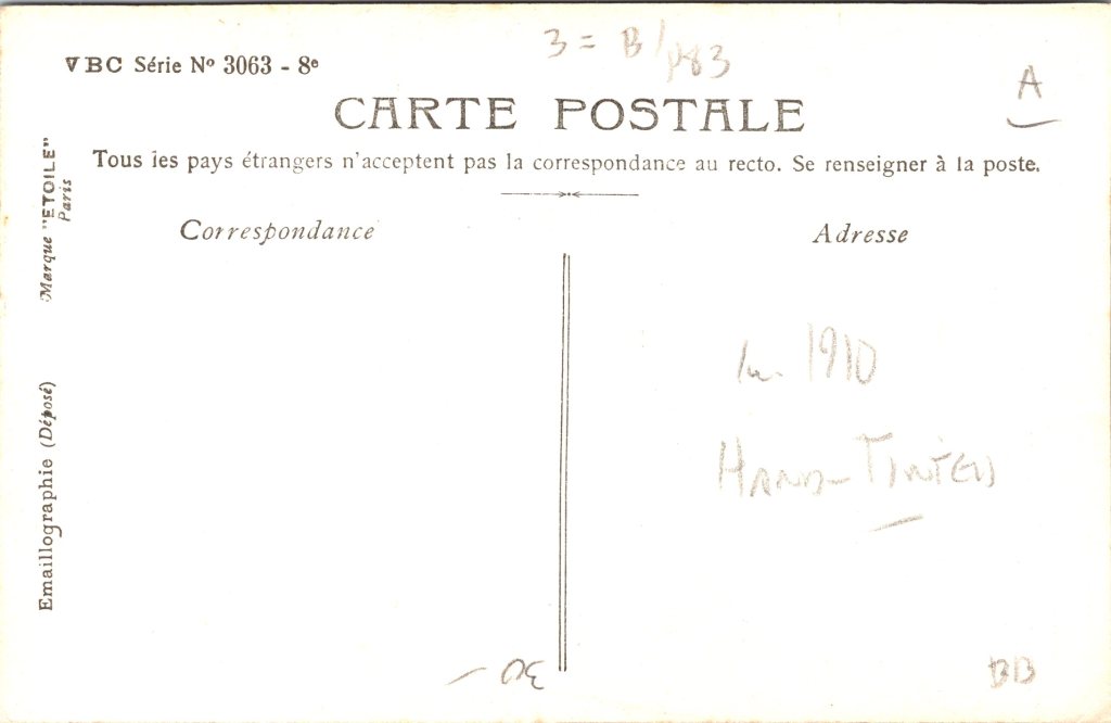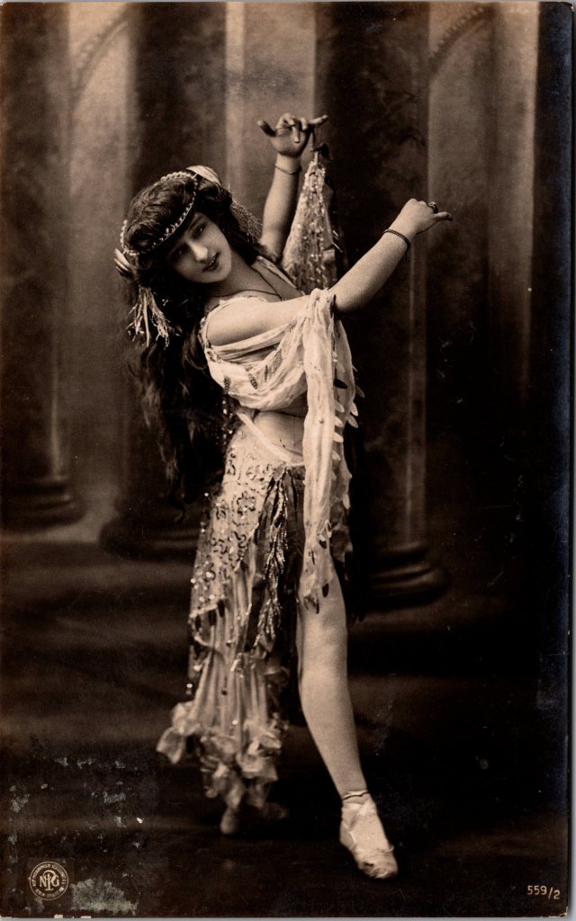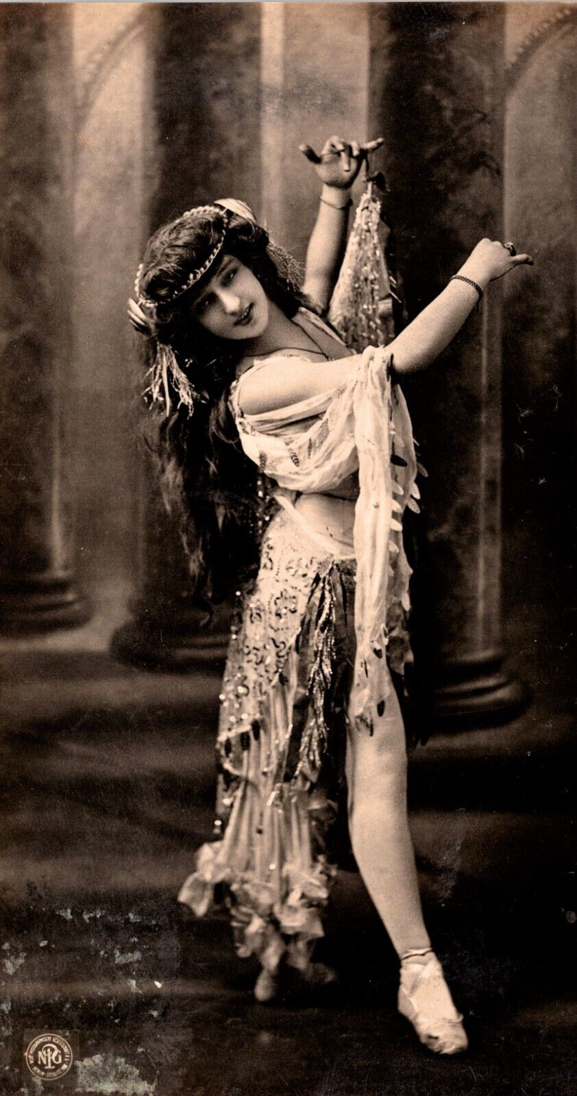This vintage real photo postcard features an unidentified pretty performer. She is posed like a dancer. This is a risque postcard. She is wearing a flesh colored body suit and is posed in a provocative manner. The model on this card was likely a minor player based on the fact that she is not named on the postcard. This photo was taken at the studio of A. Liebert, in Paris, France. The Getty Museum, located in Los Angeles, California, as well as other fine museums, have photographs in their collections by Paris photographer, Alphonse J. Liebert (1827-1913). Many of his Parisian subjects were actresses. Perhaps Miss Lesian is one of those actresses. Mr. Liebert has an interesting story. He was a photographer in Nevada City, California (1857-1862), and later, operated in Paris (1863-1890’s). He was born in France. He became an officer in the French Navy. He left the navy in 1848 to study daguerreotypy. He must have reenlisted in the navy because In 1851, he arrived in San Francisco, as a Lieutenant on a French ship. This was a time when there was much excitement about Gold mining. As a result, there was a mass desertion of the ship’s crew. The sailors joined the rush for gold. Liebert had in mind, his own venture. He and two partners decided to take on the project of refurbishing a steamship. They sought investors and hired workers to transform the ship. However, due to the partners inexperience, the venture failed. Liebert than tried gold mining but met little success. In 1857 he opened a photo gallery in Nevada City. He lost thousands of dollars after a fire in 1858. In 1859 Liebert ridiculed a former photography pupil of his, named Louis Celarie, in the press. This started a bitter professional feud. Soon after, Liebert announced that he had won a medal at the state fair. Unfortunately, there was no evidence to confirm this claim. The competition between Liebert and Celarie was fierce. Each offered special promotions to best the other. By 1861, Liebert triumphed, evidenced by the sale of Celarie’s studio. About a year later, Liebert sold his photo gallery. By 1863, he had returned to France and opened a gallery specializing in tintypes. Liebert closely identified with his photography experience in America, and as a result, he named his Paris gallery “Photographie Americaine”. Liebert began to write photography articles and books, and ultimately, invented a prototype solar camera. In 1867, Liebert had a problem with the law. He was sentenced to two months in prison and levied a fine of 200 francs. He was charged for the intent to distribute banned post mortem photographs. These were not photos of some random person. Instead, they were images of Emperor Maximillian, who had been executed in Mexico. Liebert ultimately did exhibit these photos. Liebert was becoming more and more successful. His photo gallery was so lavish that a reviewer for the British Journal of Photography wrote that it was “worthy of the smiles of the ‘God of Light’, and a repository for some of the best productions of the photographic art”. In 1879, Liebert’s gallery was the first studio to utilize electric light. By 1880, he was considered to have the most impressive photo studio in Paris. . The card was published by Star or Etoille Publishing (Paris). This postcard image was created by a process called “emaillographie”. It is interesting to note that the first five letter of the process are “email”. This postcard was part of the V B C series (No.3063). SOLD