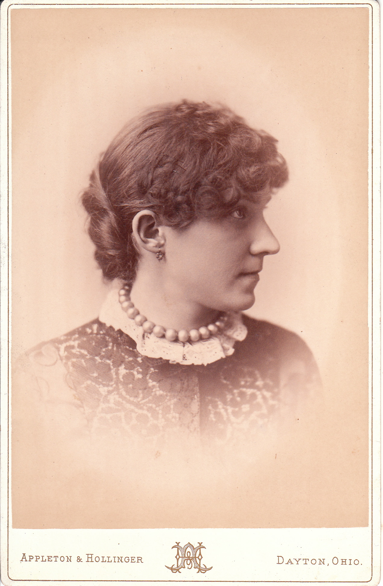 This cabinet card portrait features a profile view of a pretty young woman. She is wearing a necklace, earrings, and a serious expression. Note her lace collar. The photograhic studio that produced this image is Appleton & Hollinger which operated out of Dayton, Ohio. The studio was located at the corner of 3rd and Jefferson. To learn more about Joseph M. Appleton and William Hollinger and to view more of their photographs, click on the category “Photographer: Appleton & Hollinger”.