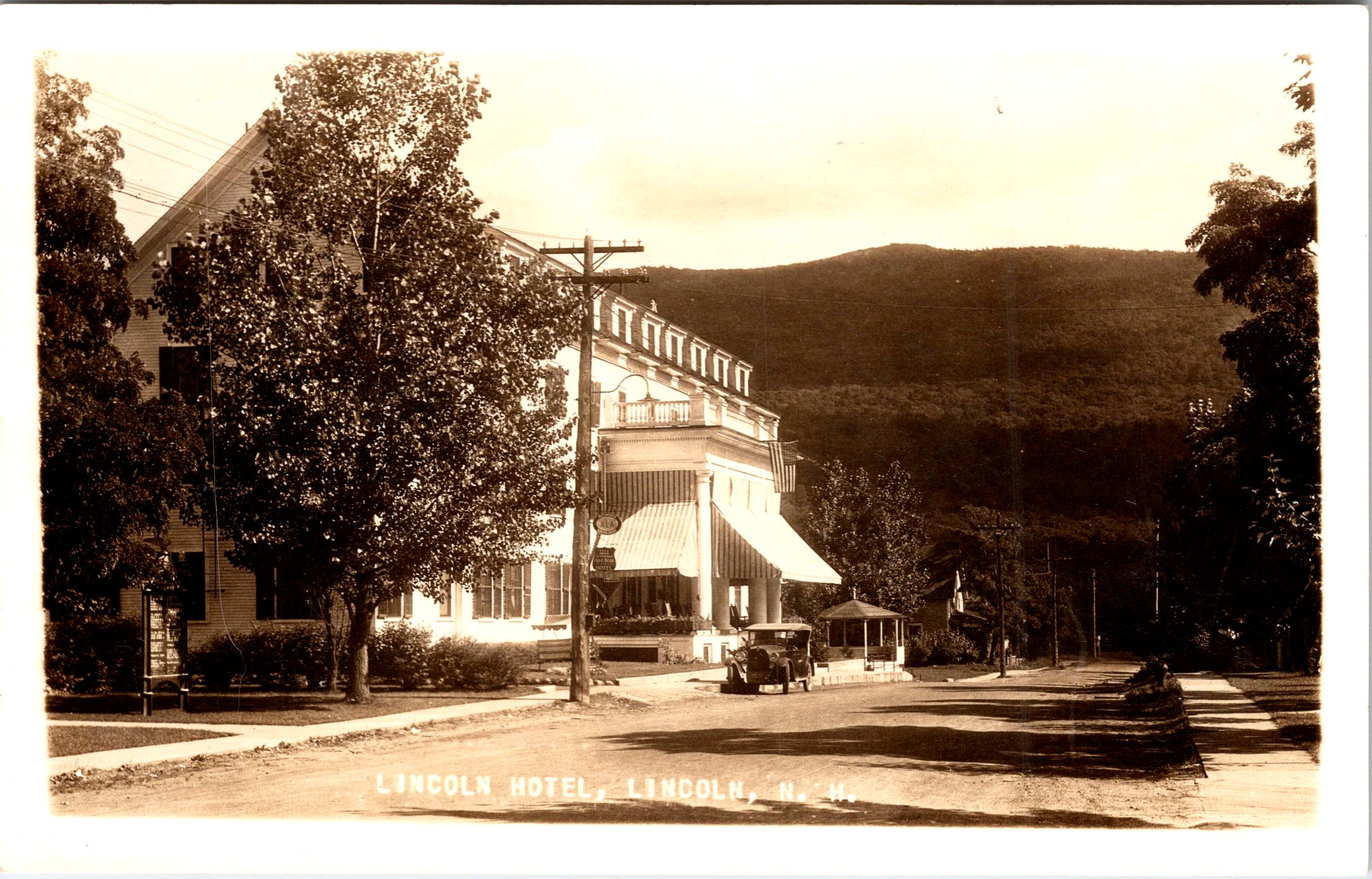 This vintage real photo postcard features a street view of the Lincoln Hotel, located in Lincoln, New Hampshire. The hotel appears to be a luxury hotel. Note the old car parked in front of the hotel. Also note the hotel’s awnings and gazebo type structure near the hotel’s entrance. Lincoln, New Hampshire is set in the White Mountains. The Appalachian trail passes through the town. This postcard photo was taken by E. D. Putnam & Son (Antrim, New Hampshire). The “Defender” stamp box on the reverse of this postcard indicates that it was produced between 1920 and 1945. SOLD