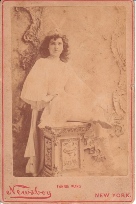 American stage and early film actress, Fannie Ward (1872-1952) is the subject of this cabinet card by Newsboy (New York). Ward was known for her comedic roles and her youthful appearance throughout most of her career. She also was well known for her role in “The Cheat” (1915). This film was by Cecil B. DeMille: and it was a very sexually charged silent film. Ward made her stage debut on Broadway a Cupid in “Pippino” with Eddie Foy. She went on to become a successful stage star in New York City. In 1898 she married a wealthy diamond merchant and retired from the stage. Her husbands business reversals spurred her to return to performing in 1905. She became very active in films between 1915 and 1929. Ward was one of those celebrities whose personal life often ended up in the newspapers. For example, the New York Times (1914), reported that Ward was being sued by actor John Dean’s wife. Mrs. Dean contended that Fannie Ward alienated Mr. Dean’s affections away from Mrs. Dean. Mr Dean and Fannie Ward had travelled together a great deal beginning in 1908 because they often acted together. Newsboy gave away cabinet cards, such as the one displayed here, as premiums to customers of their tobacco products. To view other cabinet cards by Newsboy, click on the category “Photographer: Newsboy”.