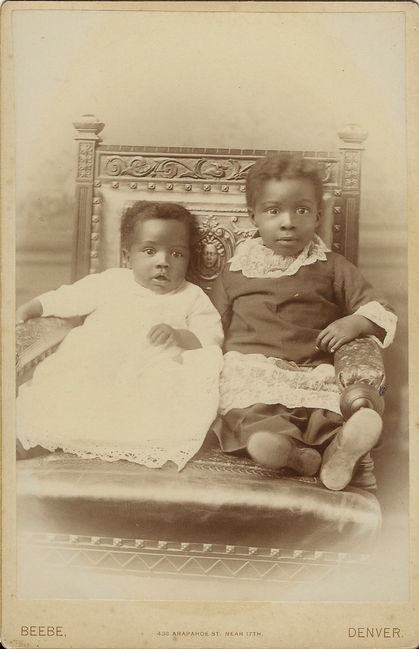 This cabinet card portrait features two young African American children sharing a large chair while posing at a photography studio in Denver, Colorado. The Beebe studio was located on Arapahoe Street within the mile high city. The children are adorable. They are looking at the photographer with bright and wide open eyes. One wonders how the youngest child is being held into the chair. Perhaps there is a brace attached to seat so that the baby doesn’t get injured due to falling or sliding onto the floor. In many cabinet card photographs of children this youngster’s age, there is a hidden parent under some fabric holding the child in place. Good quality photographs of African American subjects are not easy to find. Discrimination and economic factors are among the principal causes of their relative rarity. The photographer of this cabinet card portrait is John E. Beebe. Denver city directories indicate that he operated his studio between 1887 and at least 1894. Langdonroad.com, a historical photographer directory, reports that before his arrival in Denver, Beebe was a photographer in Chicago, Illinois.