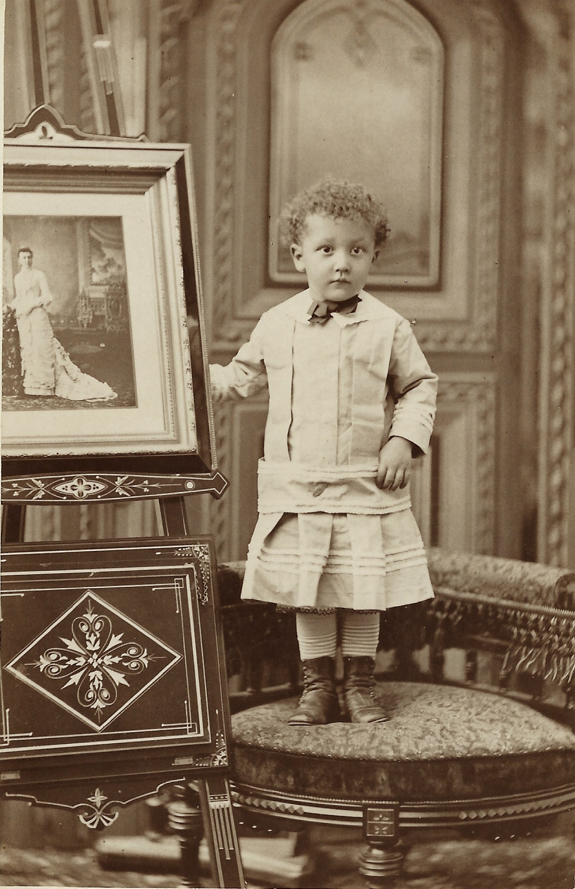 Unlike a lot of children photographed during and soon after the cabinet card era, this child is showing some emotion. It’s exciting to be able to stand on a chair and have parental permission to do so. The child looks adorable in his/her plaid outfit. Note the pretty wicker chair. The Nast studio captured this somewhat unfocussed but lovely portrait.