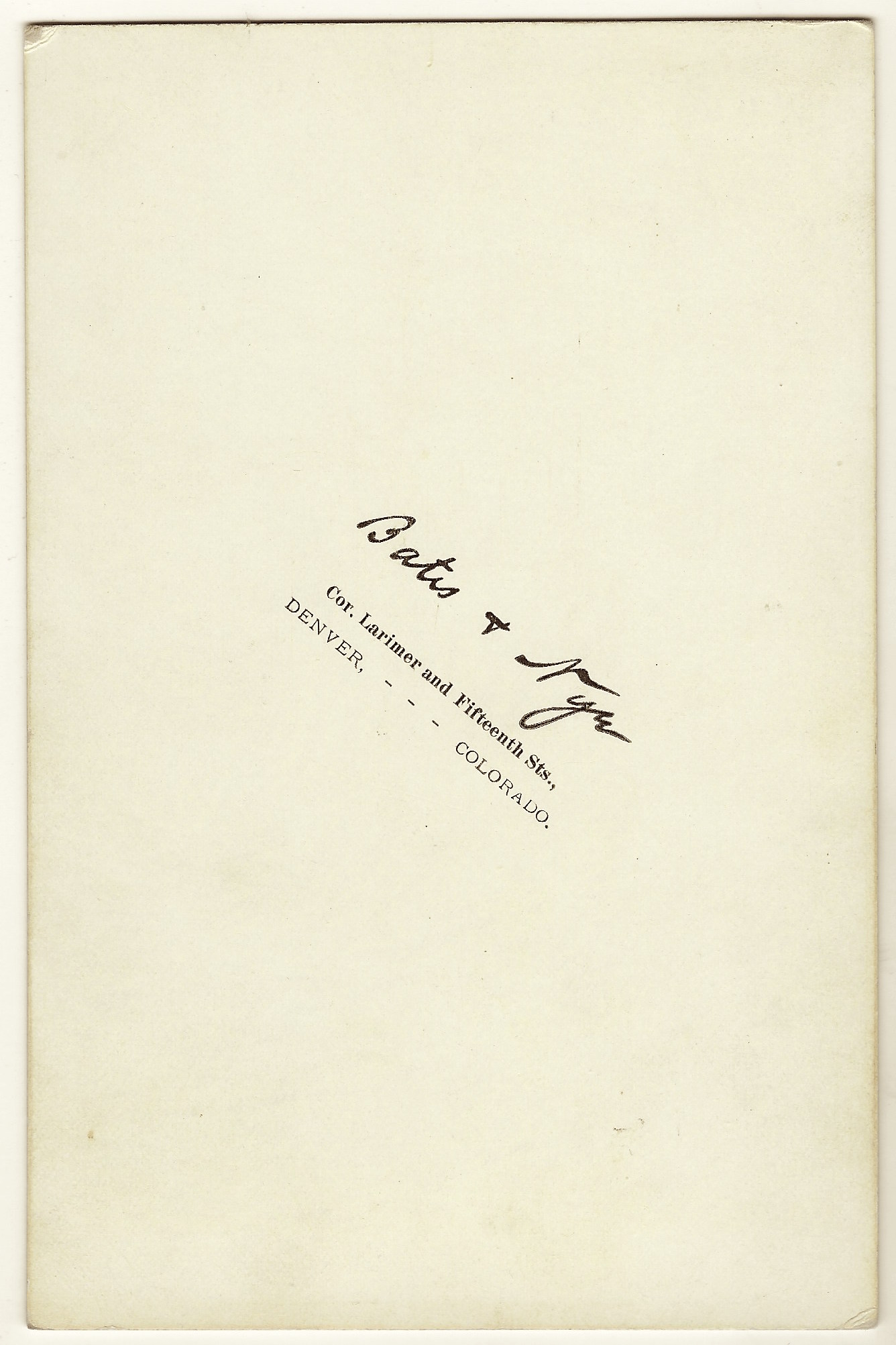 This cabinet card features two dandies posing at the Bates studio in Denver, Colorado. The studio was located in the Tabor building at Sixteenth and Larimer Streets. The subjects of this photograph are well dressed and wearing hats. Both men are holding walking sticks. The reverse of the image has an inscription that states ” Nellie Sanborn’s, 1882″. Research revealed very little about the identity of Nellie Sanborn. The only lead found is that there was a Nellie Sanborn born in Colorado in 1863 who appears in the Iowa State Census of 1885. At the time of the census she was living in the town of Keokuk and was twenty-two years old. Nellie Sanborn’s connection to the gentlemen in this image is unknown. Photographer W. L. Bates appears in the 1881 Denver city directory under the occupation of photographer. A Colorado genealogical site contends that Bates worked as a photographer in Denver between 1880 and 1890.