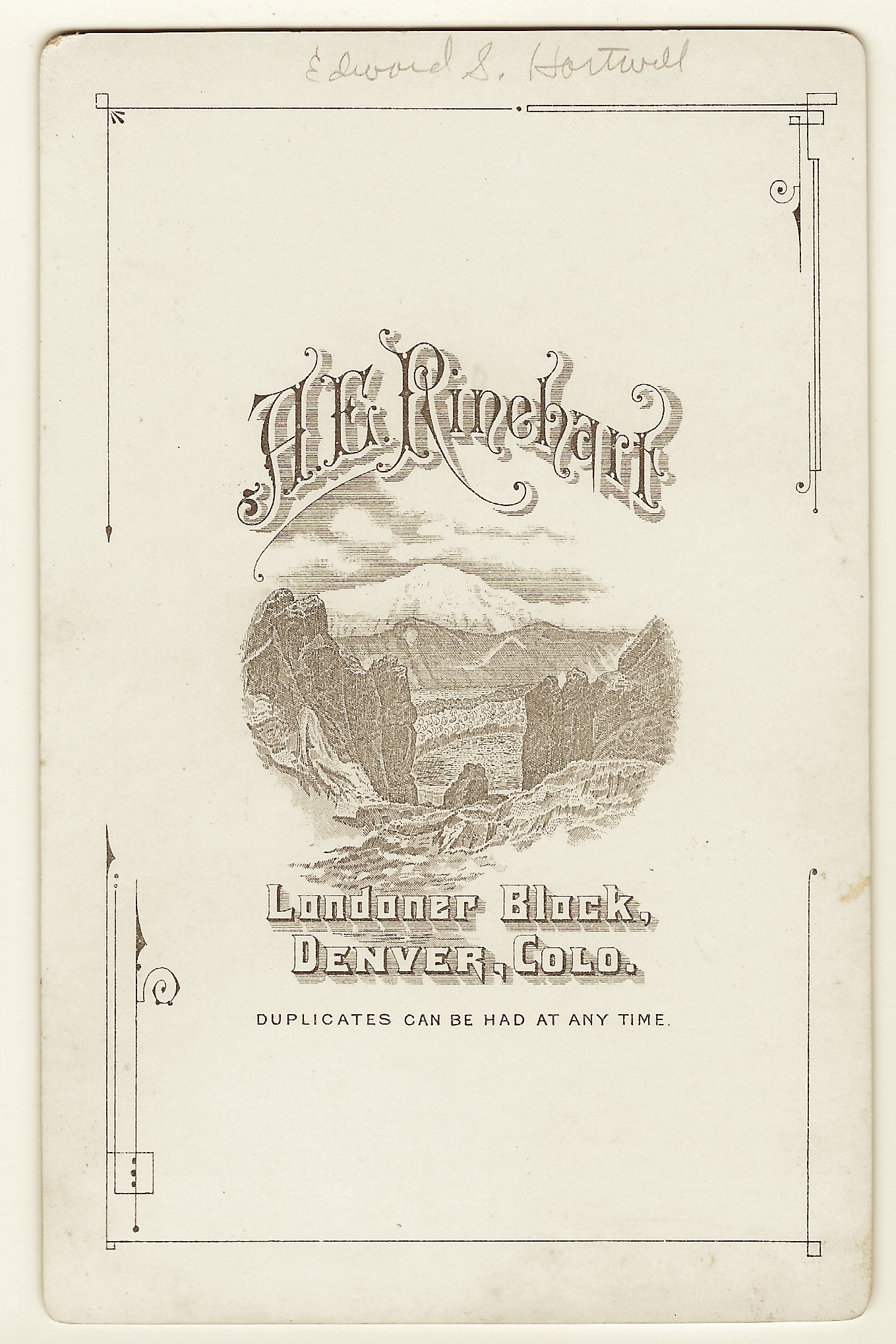 This cabinet card portrait features a handsome and well-dressed young man posing for photographer, A. E. Rinehart. The photo studio was located in Denver, Colorado. Rinehart was a well known and talented photographer. Rinehart’s studio was located on one of Denver’s oldest and most historic blocks (Larimer Street). Rinehart was a pioneer photographer who came to Denver from Lafayette, Indiana in 1874. He was the city’s leading photographer during the mining boom and photographed many of the early Denver pioneers. His subjects included Kit Carson and Mountain Man Jim Baker. Rinehart died at age 63 in 1915. Rinehart’s brother, Frank Albert Rinehart (1861-1928) was also well known for his photography, capturing Native American personalities and scenes. The reverse of this photograph has an inscription which indicates that the name of the pictured subject is Edward S. Hartwell. The 1910 census states that Hartwell was born in New York in 1867. At the time of the census he was living in El Paso, Colorado and working as an auditor for a railroad. Denver business directories reveal that Hartwell worked as a Paymaster between 1887 and 1907. He married Mamie M. King in 1891 and divorced her in 1906. To view other photographs by A. E. Rinehart, place his name in this blog’s search box. SOLD