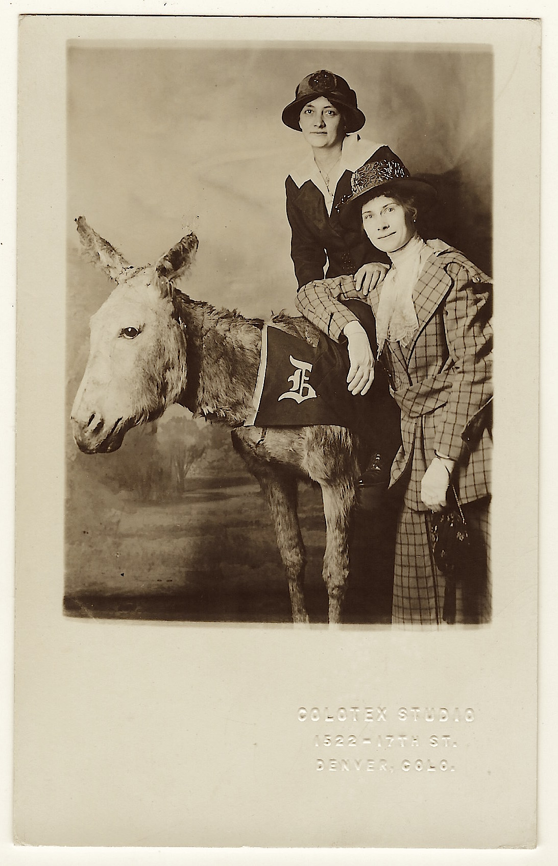 This vintage real photo postcard features two women posing with a stuffed donkey. The donkey is wearing a banner that says “Denver”. The photograph was taken by the Colotex studio which was located in Denver. My guess is that “Colotex” stands for “Colorado/Texas”. Perhaps the photographer had lived and/or worked in both states. I would also posit that the subjects in this photo are mother and daughter. The “AZO” stamp box indicates that this postcard was produced between 1904 and 1918. The postcard is in very good condition (see scans).