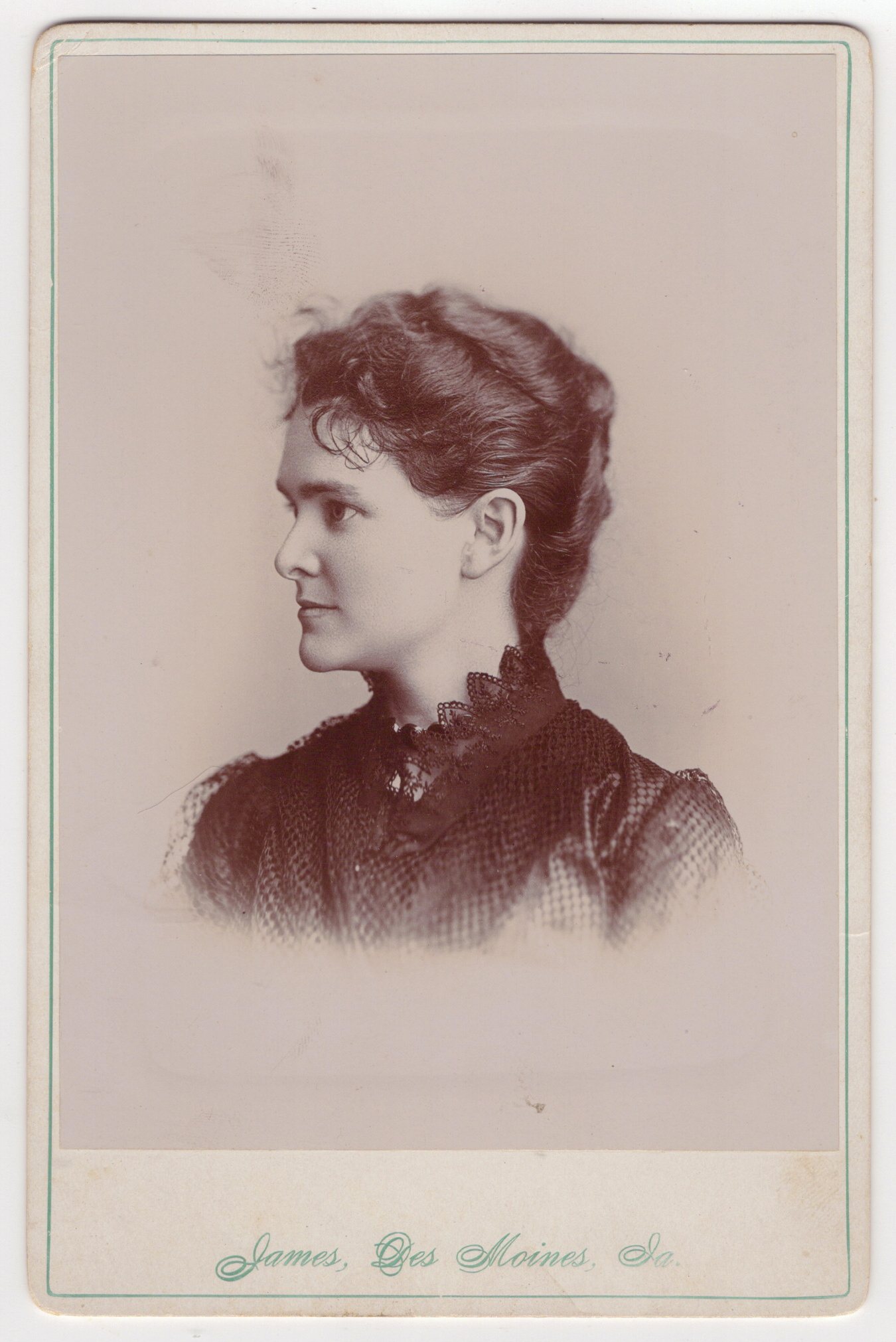 A pretty woman poses for her cabinet card portrait in Des Moines, Iowa. The photographer is named James; his first name is unknown. The young woman is wearing a scalloped lace collar and a serious expression. SOLD
