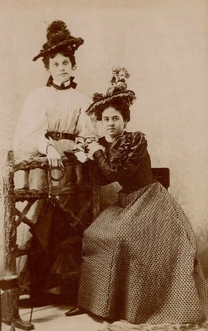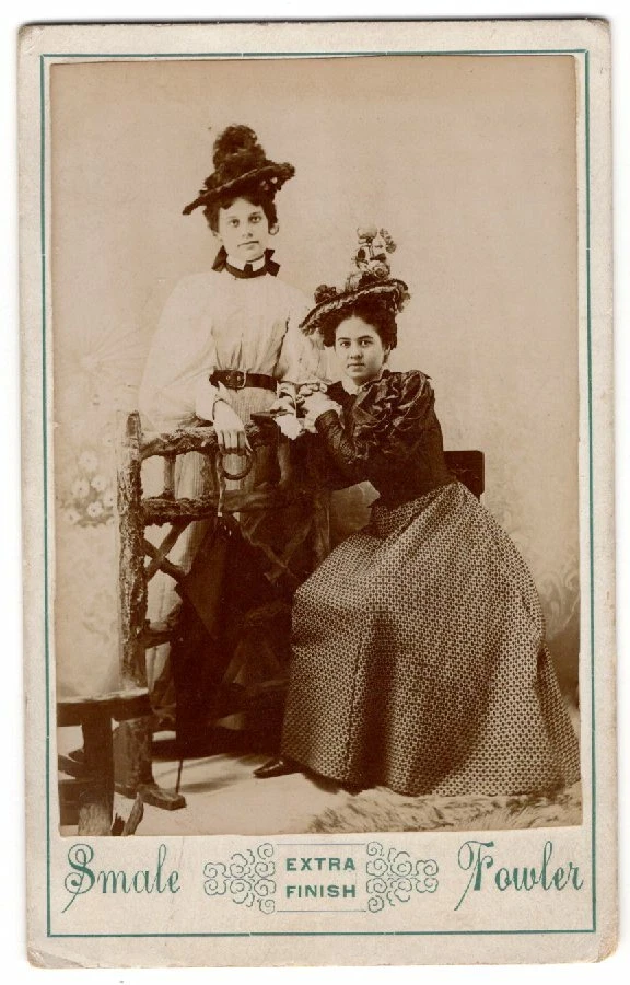 This carte de visite photograph features two pretty and fashionable women posing for their portrait at the Smale & Fowler studio. During his career, Smale operated studios in both Ottumwa and Des Moines, Iowa. Webster B. Smale (1858-1928) is listed in the Des Moines Business directory from at least 1889 through 1903. The women seen in this image are very well accessorized. Note their hats and the belt worn by the woman who is standing. Be sure to also note the hypnotizing pattern of the sitting woman’s skirt. SOLD