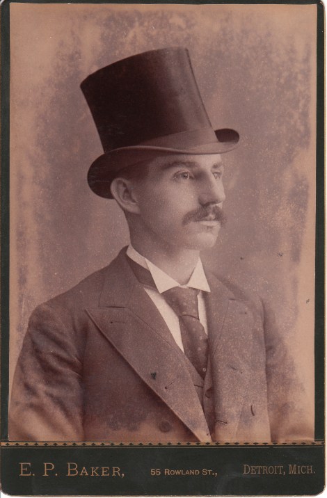 This cabinet card photograph features a young man formally dressed with a top hat on his head. “Toppers” became very popular at the end of the 18th century and remained in fashion to various degrees during the next two centuries. Viewing the fashionable man in this photograph brings up the question, “in what settings does he wear the top hat?”. The photographer is E. P. Baker of Detroit, Michigan. A Detroit business directory, published in 1873, lists Baker as owning a photographic studio at a different address than the address listed on this cabinet card.