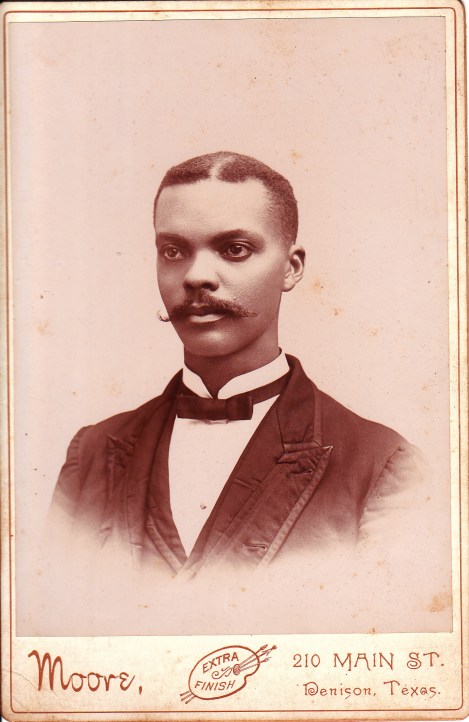 A young well dressed African American man poses for his portrait at the Moore studio in Denison, Texas. The town of Denison was founded in 1872 in conjunction with the Missouri-Kansas-Texas Railroad. In 1875, famed western gambler, gunfighter, and dentist, John Henry Holliday (Doc Holliday), had offices in Denison. Doc Holliday is also known for his great friendship and shared exploits with lawman Wyatt Earp.