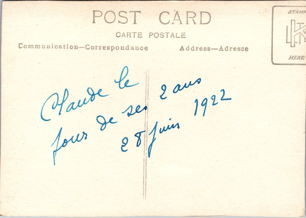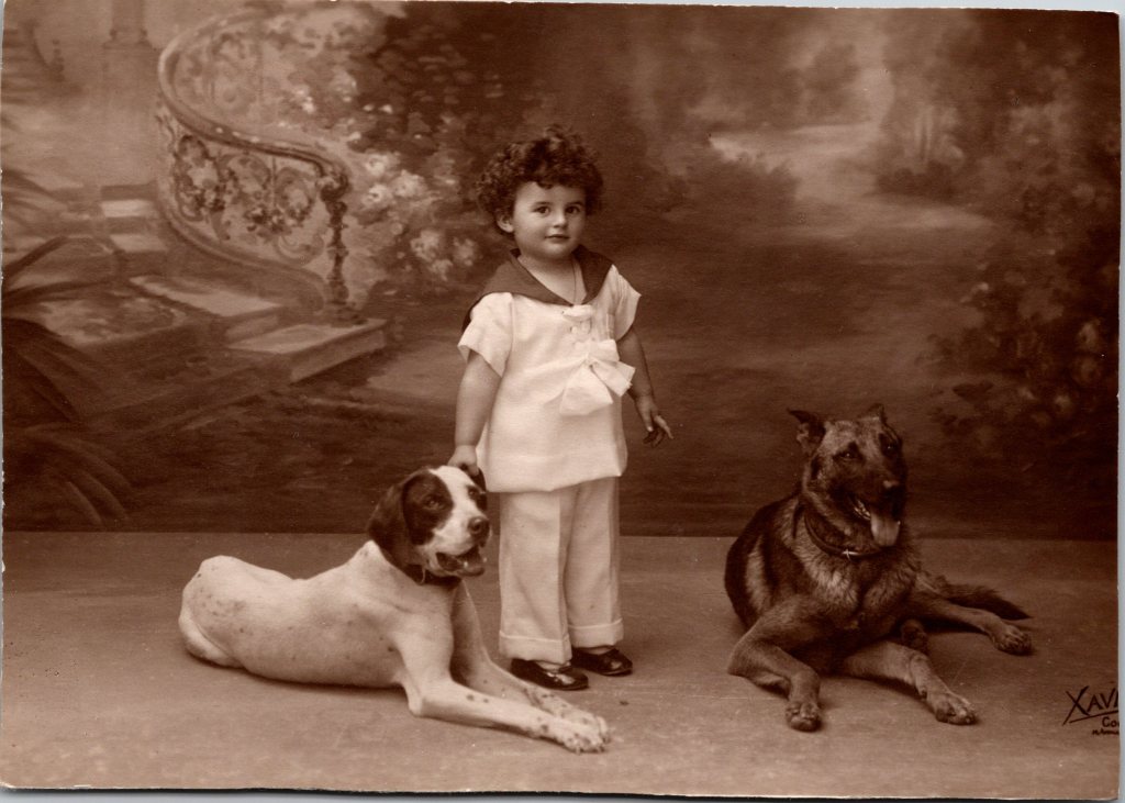 This vintage real photo postcard features an adorable young child and two very large dogs. The child is wearing a nautical type outfit and it’s top includes a large bow. Two large dogs lie beside their young master. An inscription of the reverse of the card indicates that the child’s name is Claude and that he was two years old at the time that this photograph was taken. The inscription reveals that the photo was taken in 1922. The card has a K Ltd. stamp box. This postcard has been trimmed to fit into an album or picture frame. The card measures about 4 1/2″ x 3 1/8″, has excellent clarity, and is in excellent condition. (SOLD)