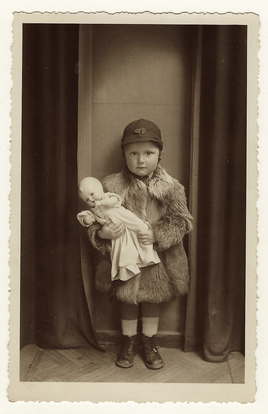 ADORABLE LITTLE GIRL WEARING A FUR COAT AND HOLDING A DOLL