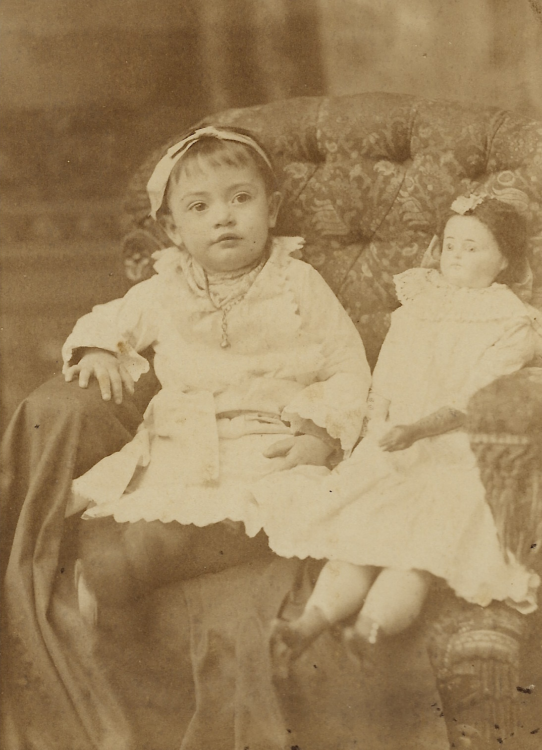 This vintage photograph features and adorable little girl sitting on a wall and holding her doll for all to see. I know very little about dolls, but, this one seems to be made out of wood. This photo was taken at a studio in Paris, France. The photographer was E. Chapuis. Preliminary research yielded no biographical information about Mr. Chapuis but he appears to have been a prolific photographer based on the number of his photos that are in the hands of collectors. This photograph measures about 2 1/4″ x 3 7/8″. SOLD