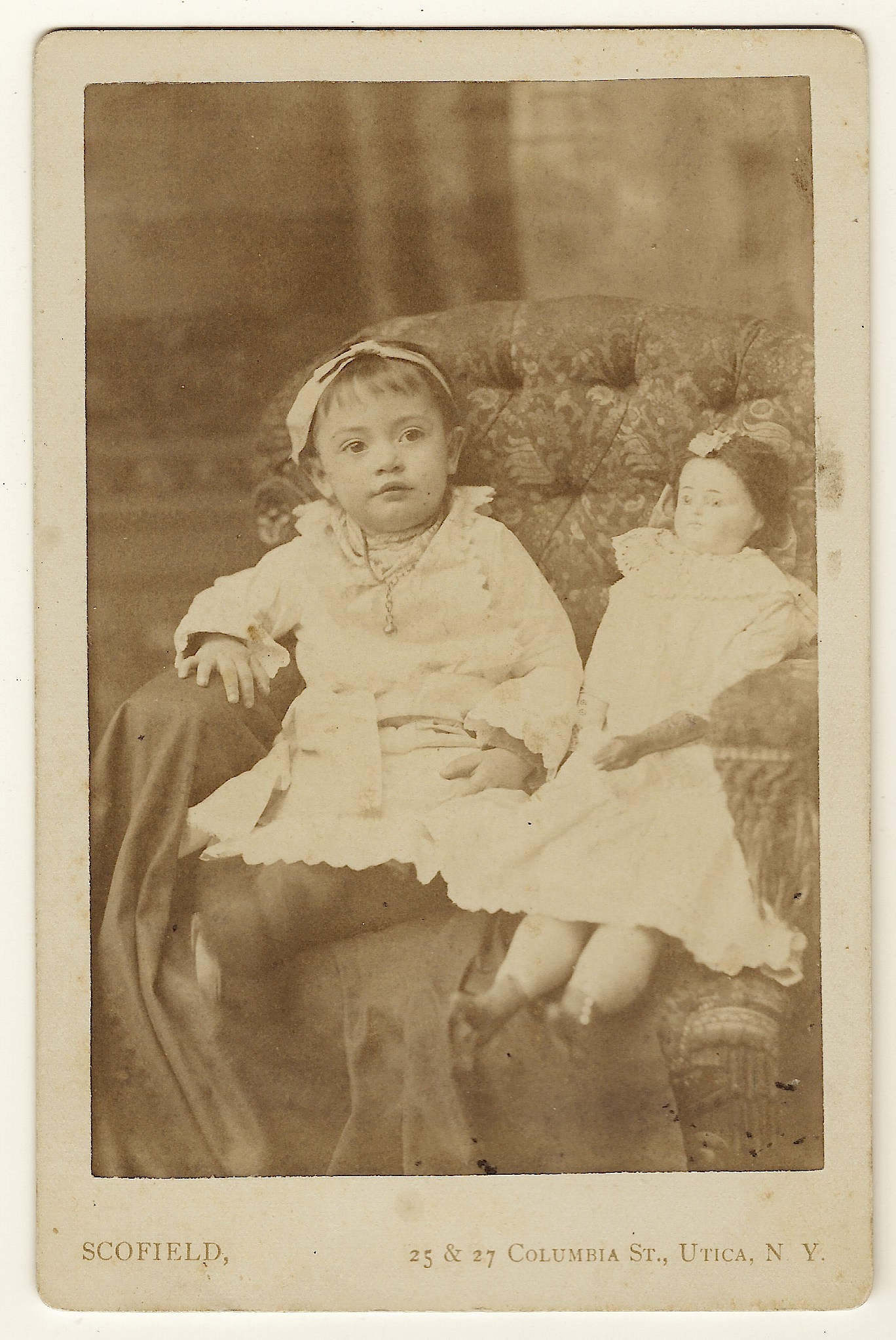 A precious baby girl, sitting on a chair, poses next to her large doll. The cute little girl has the most darling expression as she looks at the camera. She is wearing a necklace and a hair band. This cabinet card photograph was taken at the Scofield studio in Utica, New York. Charles H. Scofield (1845-1918) was active as a photographer in Utica between 1874 and 1879. A stereoview portrait by Scofield is part of the collection at the J. Paul Getty Museum, in Los Angeles, California. Scofield held a photography patent for an “adjustable camera and box”, according to the Anthony Photographic Bulletin (1886). The 1880 US census reveals that he was married to Fanny Scofield. A photographer named Charles Albert Scofield operated in Utica. He is listed in the 1894 Utica business directory, as well as, other editions. He was the son of Charles H. Scofield. This cabinet card photograph is in good condition. Note that there is slight fading, as well as some spots in the lower portion of the image (see scans).