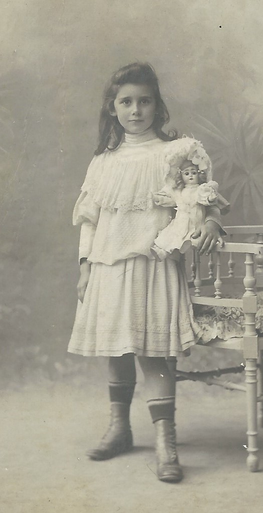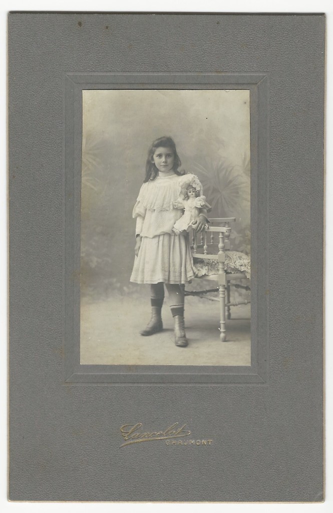 This vintage photograph features an adorable little girl holding her cherished doll as she poses for her portrait at the Lancelot studio in Chaumont, France. The town is located in the North Central part of the country. Dolls have been around for a long time. In fact, there is archaeological evidence that indicates that dolls may by the oldest known toy. Wooden dolls were found in Egyptian tombs that date back to the 21st century BC. Remarkably, dolls with movable limbs and removable clothing existed in at least 200 BC. This vintage photo is in very good condition (see scans). SOLD