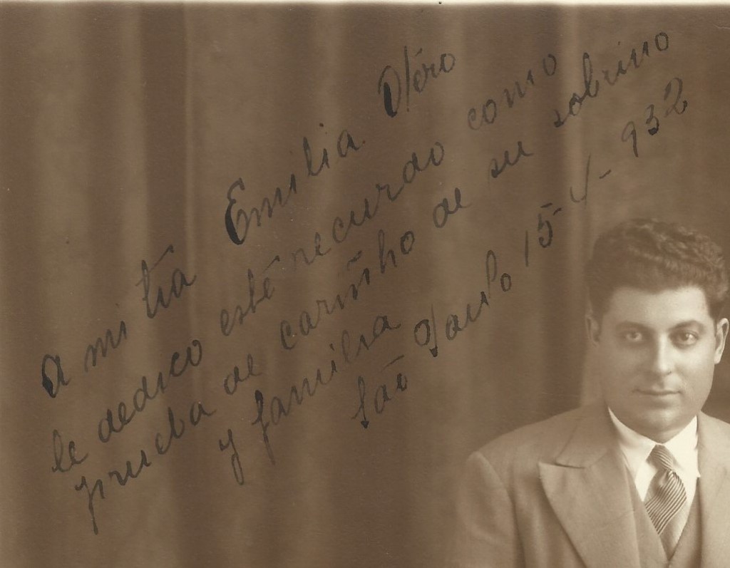This vintage photograph is portrait of a handsome family. The children are adorable. One of the girls is holding a doll. The youngest child is sitting in a miniature chair. There is an inscription in the top left hand corner of the image. The inscription is written to “Aunt Emilia” and was written in San Paolo, Brazil, in 1932. The photographer of this photo is identified in a light embossed stamp that is barely visitble in the bottom right hand corner of the image. Proper magnification will likely result in identification of the photographer and studio. A look at the reverse of the image reveals that it was once a resident of a photo album. This photograph measures about 6 1/2″ x 9″ and is in very good condition (see scans). (SOLD)