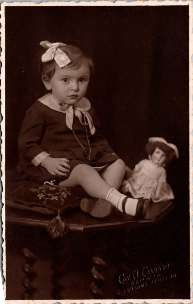 This vintage real photo postcard features an adorable little girl sitting on a cushion alongside her fancy dressed doll. Note the girl’s cute hair bow. It appears that she doesn’t know what to make of her experience at the photo studio. This exlempary postcard portrait was taken at the Calosso studio in Genoa, Italy. The photographers stamp can be seen in the bottom right hand corner of the image. This postcard is in good condition (see scans).