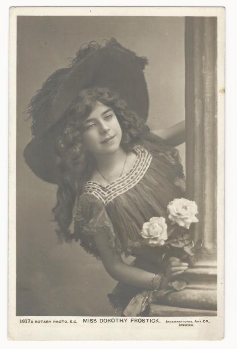 This vintage real photo postcard features English actress, dancer, and singer; Miss Dorothy Frostick. In 1901, Frostick made her debut in the successful musical dream play, “Bluebell in Fairyland”. The play appeared at London’s Vaudeville Theatre. The stars of the show were Seymour Hicks and Ellaline Teriss, a theatrical married couple. Frostick appeared again with the couple in “The Cherry Girl” (1903) and in a revival of Bluebell in 1905. There is a void of information about Miss Frostick until 1912 at which time she joined a pierrot group, “The Quaints”. She appeared with the group until at least 1914. Her final documented London appearance was in a musical and dance production, “The Latest Craze” (1919). The show bombed and closed after twenty-five performances. A portrait of Dorothy Frostick appears in England’s National Portrait Gallery. The photo on this postcard was produced by the International Art Company, which was based in Ipswich, England. This postcard was published by Rotary Photo (active 1897-1916) as part of their Rotary Photographic Series (no. 1617D). SOLD