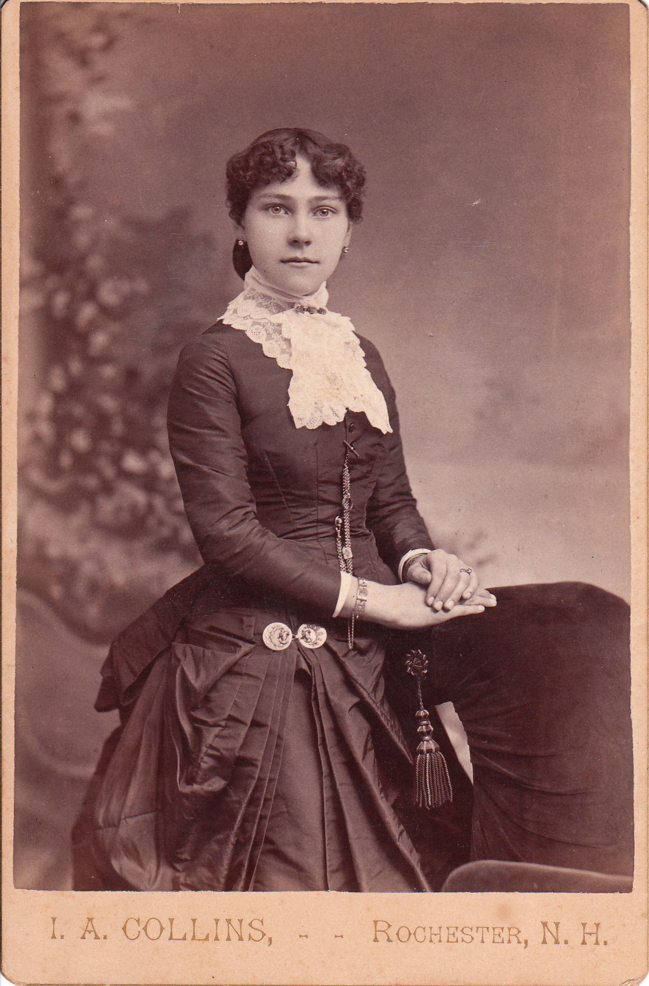 Photographer I. A. Collins of Rochester, New Hampshie, produced this cabinet card portrait of a lovely woman. She is wearing a pretty dress and an abundance of jewelry. Note her bracelet, ring, pin and chains. Her dress has two very large buttons and hopefully one of the fashion experts who visit the Cabinet Card Gallery can explain the purpose of the buttons. It appears as if the buttons are held together by a clasp and serve to keep the skirt portion in position.Very little information could be uncovered about photographer I. Collins. He was listed in the Dover, New Hampshire business directory (1889 and 1891) as a photographer. The directories report that the gallery was located on a street named Hanson.