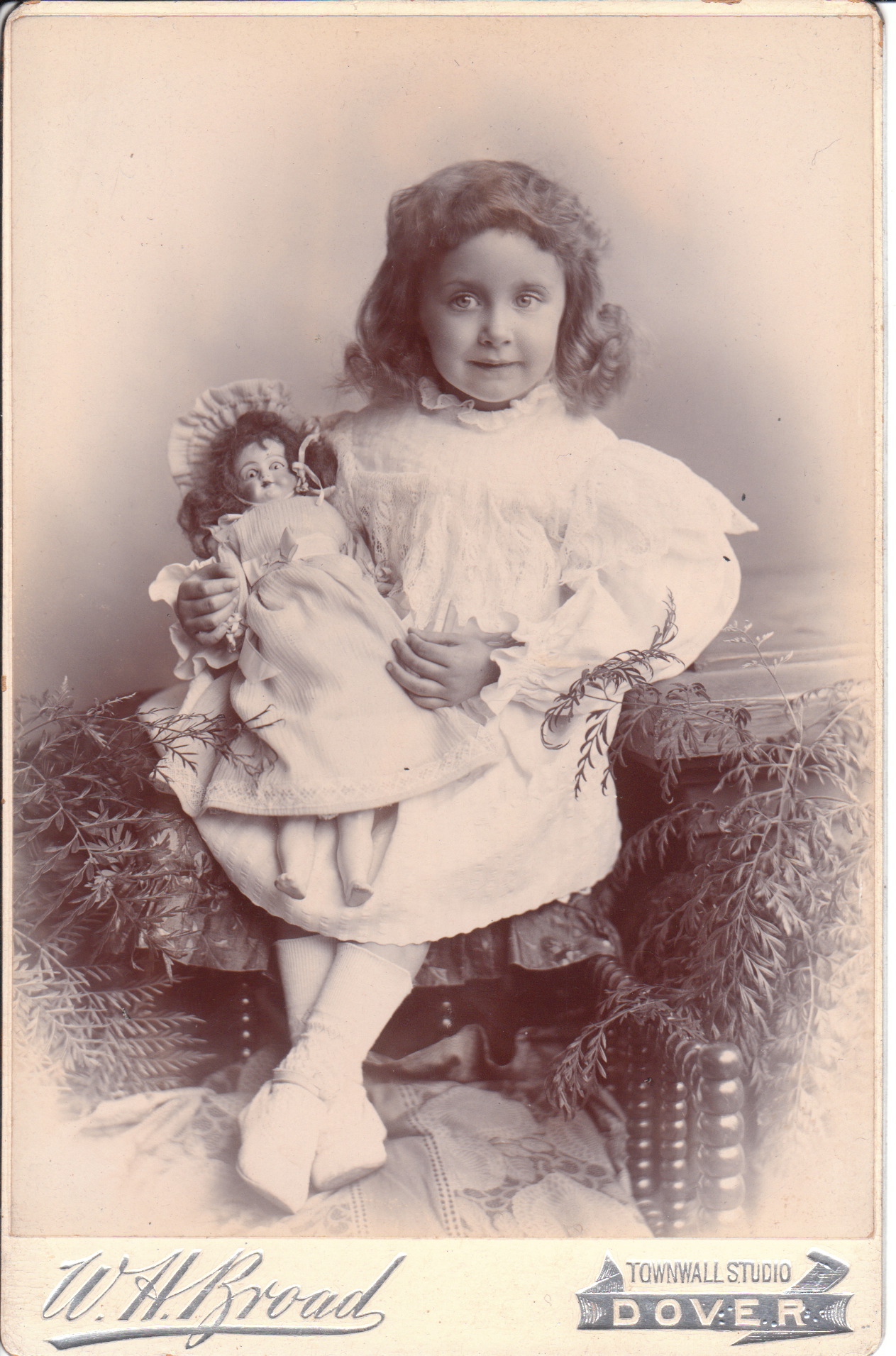 An adorable and sweet looking little girl poses with her beautiful doll in this portrait by W. H. Broad of the Townwall Studio in Dover, England. She is sitting near a careful arrangement of fern or some other plant leaves. The child’s expression could be described as “frozen in happiness”.