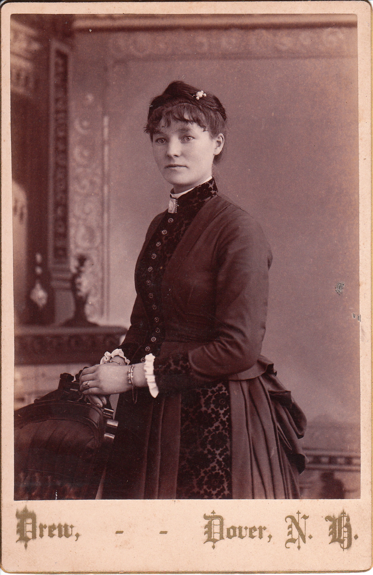 An angelic looking young girl dressed in white, poses in an artistic portrait at the Drew Studio in Dover, New Hampshire. The little girl does not appear very happy about the process of being photographed. She has corkscrew curls and is wearing hair ribbons. She is sitting cross legged in a white wicker chair. The photographer of this large format image is A. P. Drew. The Dover Enquirer (1896) has an article which mentions Alfred Palmer Drew. In 1896 a “deluge” and subsequent fire destroyed a business block and three bridges in Dover. The flooding sent the stores on the block down the Cocheco River. The photography studio Drew and Boomer was among the stores washed away. The Bulletin of Photography (1917) contains the obituary of A. P. Drew. He died at the age of 81. He had been born in Dover and had worked as a photographer there for more than 50 years. He retired in about 1914. During the civil war he had been a member of the Strafford Guards. The regiment was originally established in 1822 and a year later became part of the New Hampshire State Militia. In 1864 the Strafford Guards were mustered into service of the Union Army for a period of sixty days. They relieved a New Hampshire artillery unit that had been sent to the front. A. P. Drew served as a corporal.