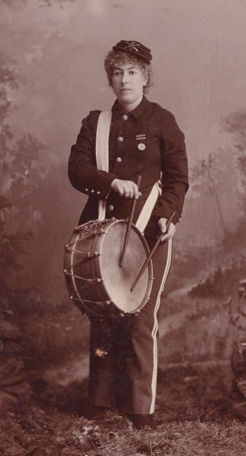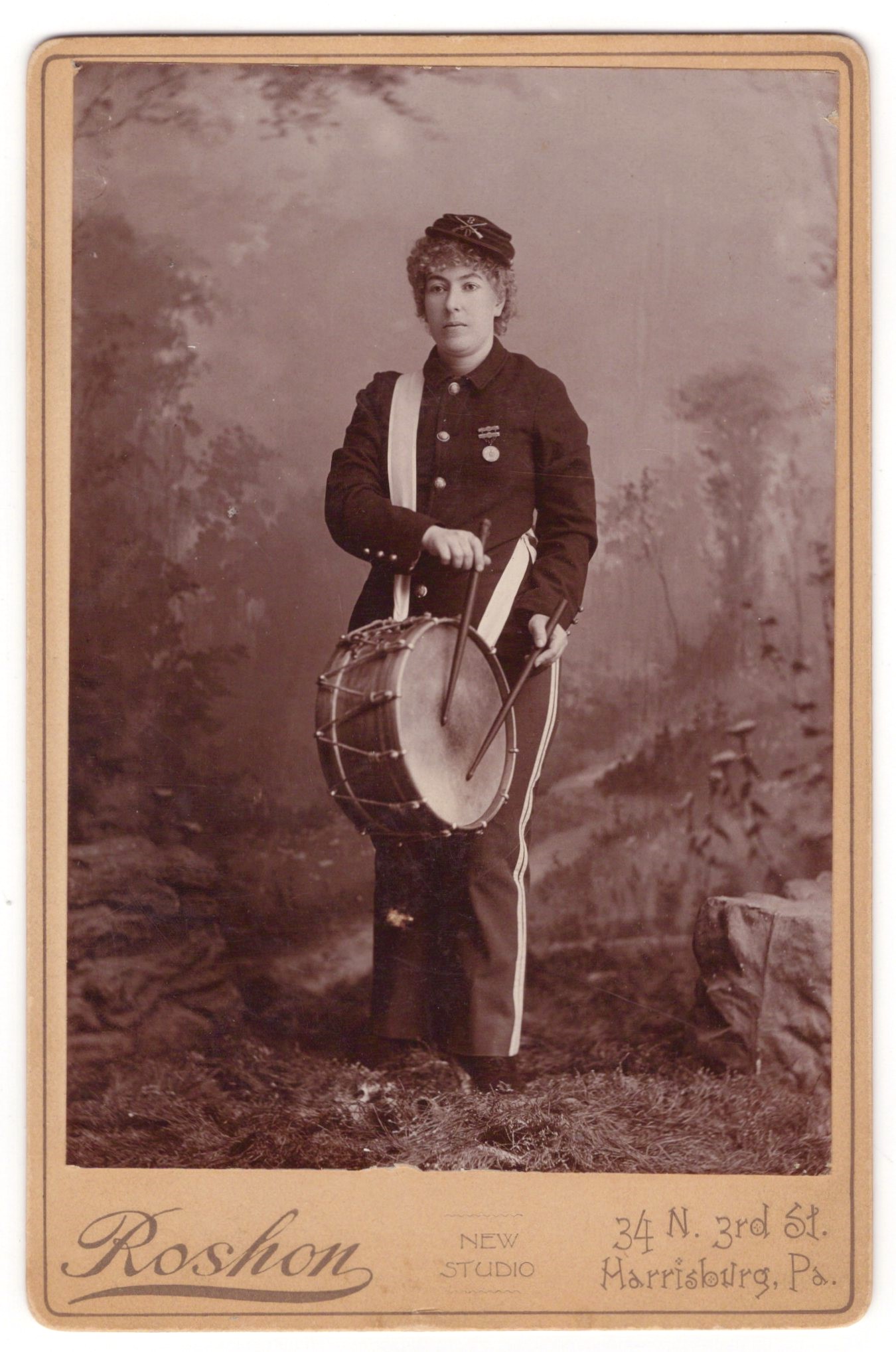 A LADY DRUMMER IN UNIFORM : HARRISBURG, PENNSYLVANIA : RARE : CABINET CARD