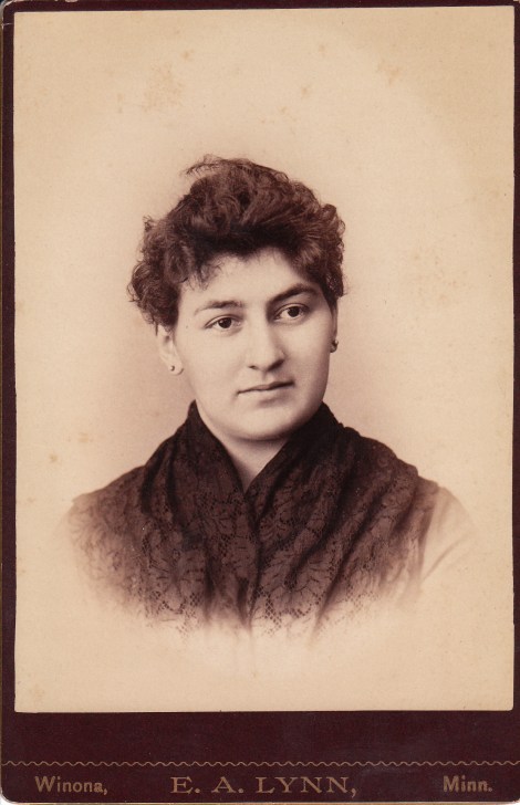 A pretty young woman poses for her portrait in the studio of E. A. Lynn, in Winona, Minnesota. The woman appears poised in front of the camera and she has an alert and amused expression. The photographer may be the same E. A. Lynn who had photographic studios listed for sale in Seattle and Tacoma, Washington. His “for sale” notice was listed in a 1911 photographic journal. E. A. Lynn also served as the Vice President (for the state of Washington) of the Photographers Association of the Pacific Northwest.