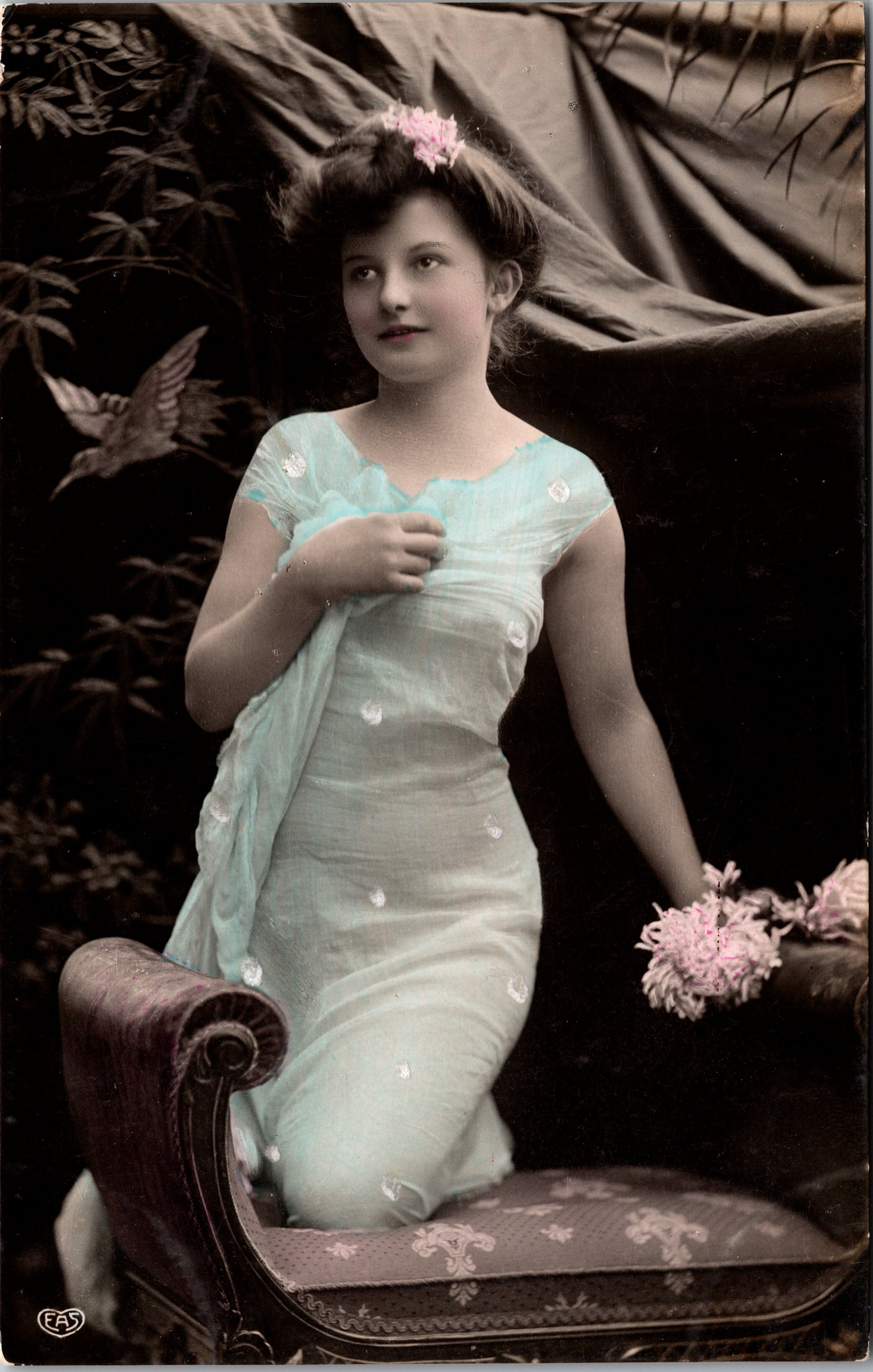 Postcard 1 features German actress, Emily “Emmy” Wehlen (1887-1977). She was a Edwardian musical comedy and silent film actress. She retired from acting at a young age (early 30’s), Wehlen received her musical training at the Mannheim Conservatory. She then joined the Thalia-Theatre and performed in musical comedies in several German cities. She was then invited to London and was considered as a possible successor to Lily Elsie. Wehlen played the lead role in “The Merry Widow” (1909). Later that year she appeared in the hit musical “The Dollar Princess” which ran for 428 performances. Next stop was New York, where she appeared in four Broadway plays between 1911 and 1915. Shortly after her last Broadway appearance, Wehlen left the stage and pursued a film career. She appeared in over twenty films between 1915 and 1920. “Everybody’s Magazine (1911) reported that Wehlen was very pretty and very graceful. Her acting and voice were also praised. In addition, the article stated that “she has the indescribable charm of personality” and that audiences liked her and wanted her to never leave the stage during a production. Miss Wehlen’s photograph on this postcard was taken by celebrity studio, Foulsham & Banfield. The card was published by Rotary Photo as part of a series (no.11717H).