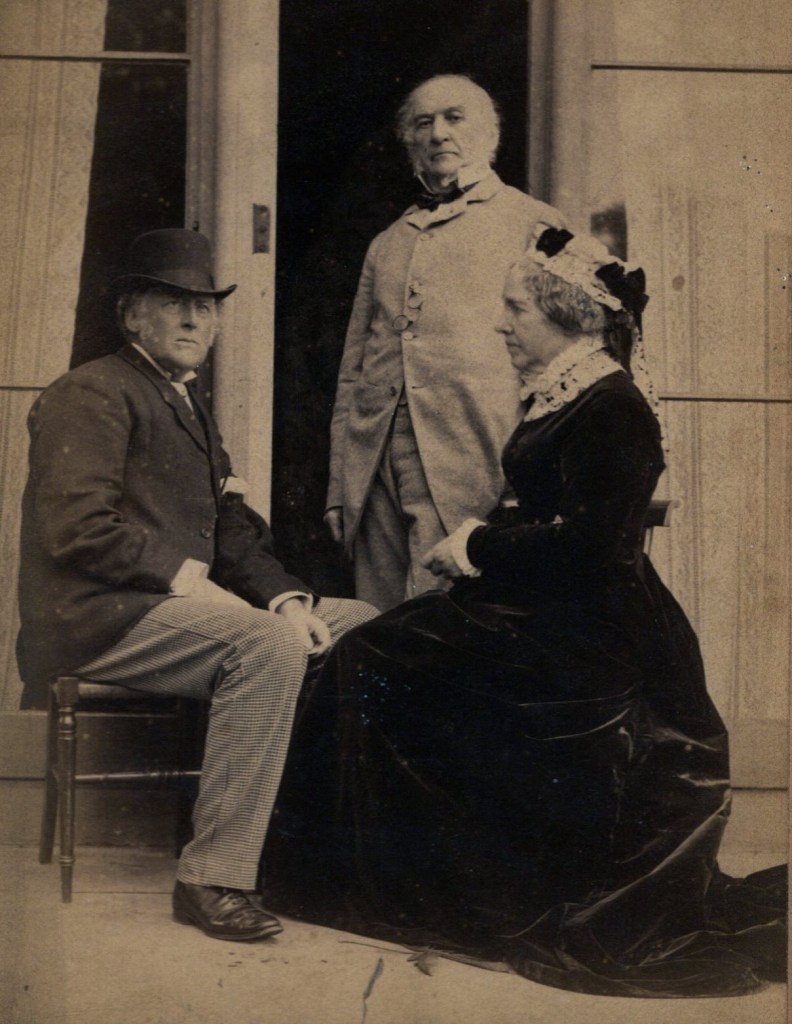 This cabinet card features the Rt Hon W. E. Gladstone, M.P. (1809-1898), his wife, Catherine Glynne Gladsone (1812-1900), and Sir J.E. Millais Bart R.A. (1829-1896). William Ewart Gladstone was a Liberal politician and statesman. He served for over twelve years as the British Prime Minister. Bart was a noted English painter and illustrator. He was one of the founders of the Pre-Raphaelite Brotherhood.This image was photographed by the Elliott & Fry studio located on Baker Street in London, England. The studio was well known for photographing Royalty, Celebrities, and other important people of the time. (SOLD)