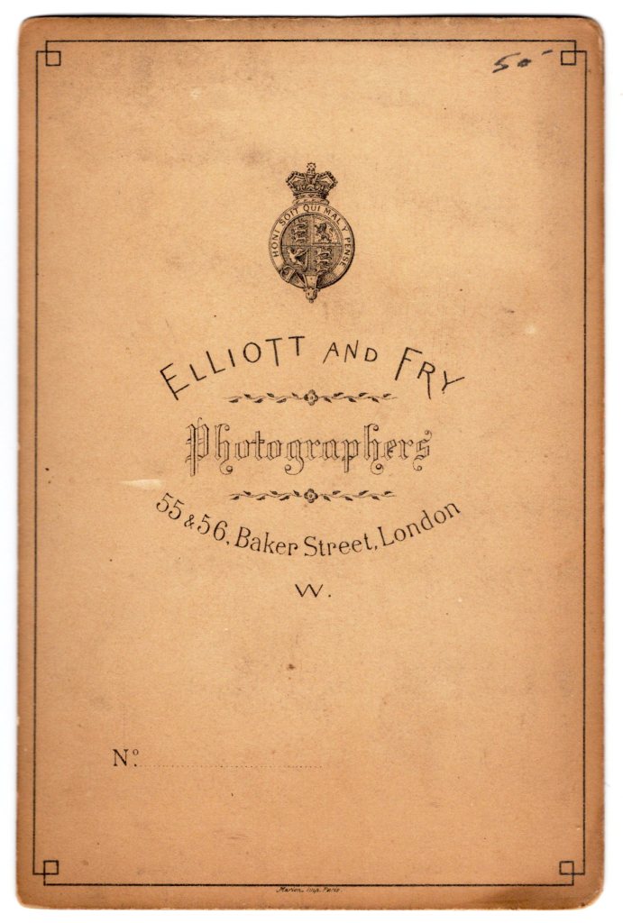 This cabinet card portrait features stage actress Eveleen (Evelyn) Rayne. She became titled when she married George Fitzwilliam in 1888. She died in 1925. The Elliott & Fry studio produced this image. This Victorian photographic studio and photographic film manufacturer was founded in 1863 by Joseph John Elliott and Clarence Edmund Fry. For an entire century the studio took and published images of leading Victorian luminaries from the fields of science, public service, art, politics as well as celebrities of the day. To view other photographs by this studio click on the category “Photographer: Elliott & Fry”.