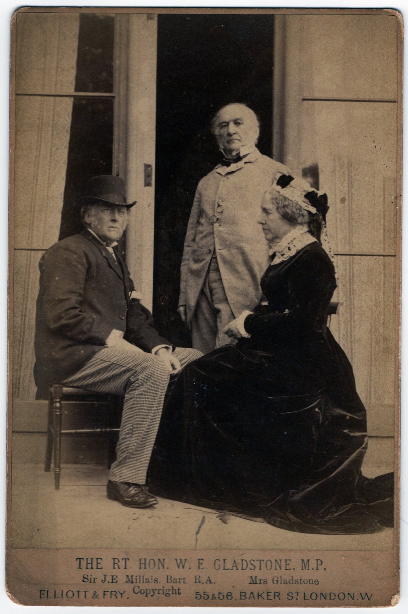This cabinet card features the Rt Hon W. E. Gladstone, M.P. (1809-1898), his wife, Catherine Glynne Gladsone (1812-1900), and Sir J.E. Millais Bart R.A. (1829-1896). William Ewart Gladstone was a Liberal politician and statesman. He served for over twelve years as the British Prime Minister. Bart was a noted English painter and illustrator. He was one of the founders of the Pre-Raphaelite Brotherhood.This image was photographed by the Elliott & Fry studio located on Baker Street in London, England. The studio was well known for photographing Royalty, Celebrities, and other important people of the time. (SOLD)
