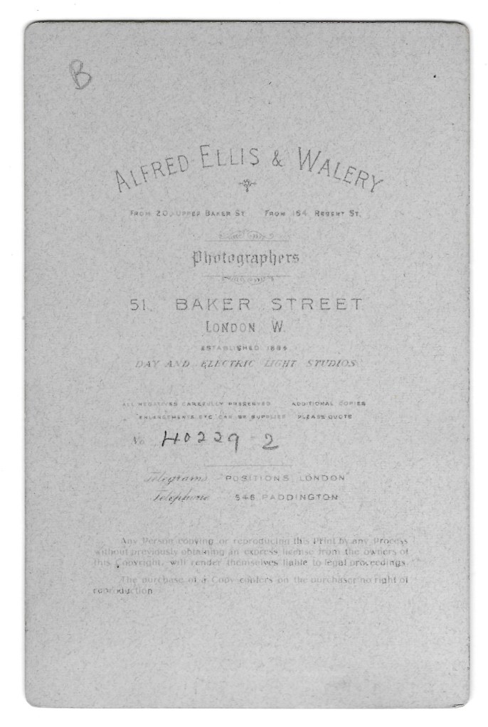 The second postcard of Miss Elsie provides a terrific close-up photograph of the beautiful Miss Elsie. She is wearing a dark jacket, a frilly high collared blouse and a ribbon bow tie. Her accessories include a long necklace, a pin low on her blouse, and a corsage. The postcard is part of the Rotary Photographic Series (no. 4159 J) published by Rotary Photo. The photograph was taken by the Foulsham & Banfield Studio. Foulsham & Banfield were well known celebrity photographers. Frank Foulsham and A. C. Banfield operated a studio in the 1900’s through the 1920’s.