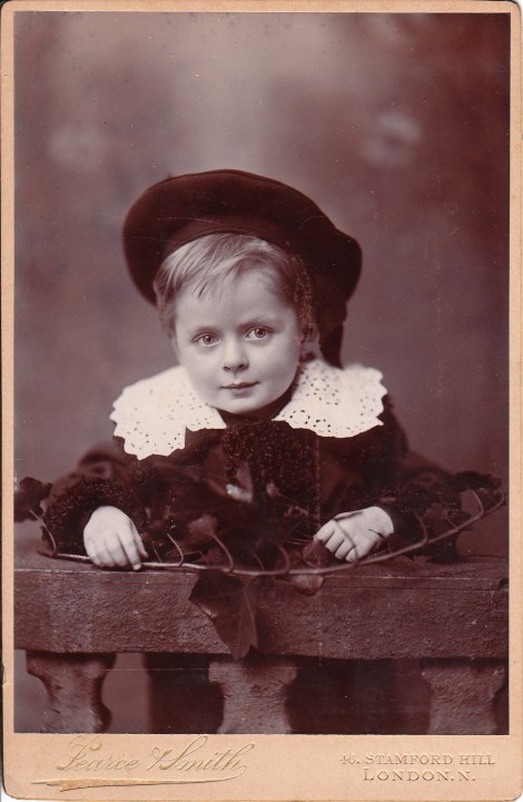 This portrait features a beautifully dressed cute child. The child appears to be a girl, but this is only a guess. The child’s fancy outfit includes a lace collar and a pretty cap. She is holding a branch with only a single leaf. The studio that photographed this child is Pearce & Smith of London, England.
