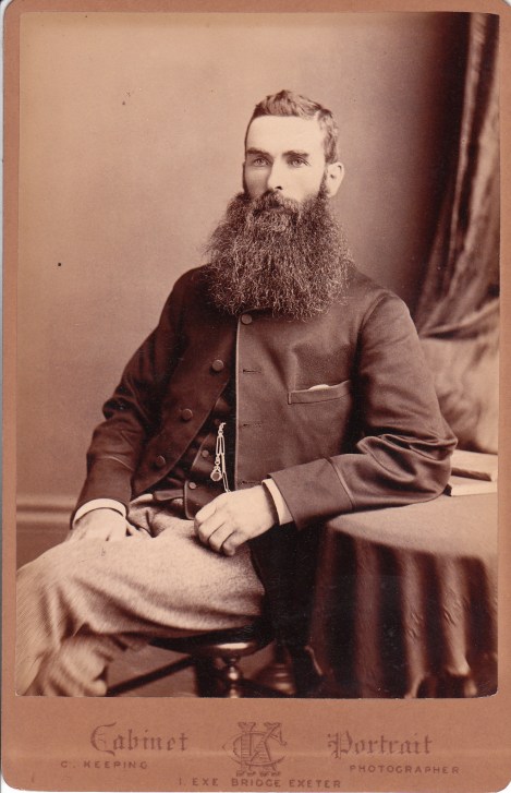 A well dressed man poses for his portrait at the studio of Charles Keeping in Exeter, England. The subjects beard looks remarkably similar to a Brillo pad. Pity his poor wife during their amorous times together. The photographer, Charles Keeping (1842-?) was born at Lymington in Hampshire. He first worked as a photographer in Exeter in about 1870.He set up a studio at New Bridge Street after moving to Exeter from Torquay between 1867 and 1870. The studio moved to the address listed on this cabinet card (1, Exe Bridge) in 1873. Keeping also had a number of branch studios. In the mid to late 1880’s the business was known as the “Exonia Studio”. The available history indicates that this image was produced between 1873 and the late 1880’s. The subjects steel wool type beard is his ticket to enter the Cabinet Card Gallery’s category “Beards (Only the Best). Click on the category to see an amazing collection of unusual and interesting beards.