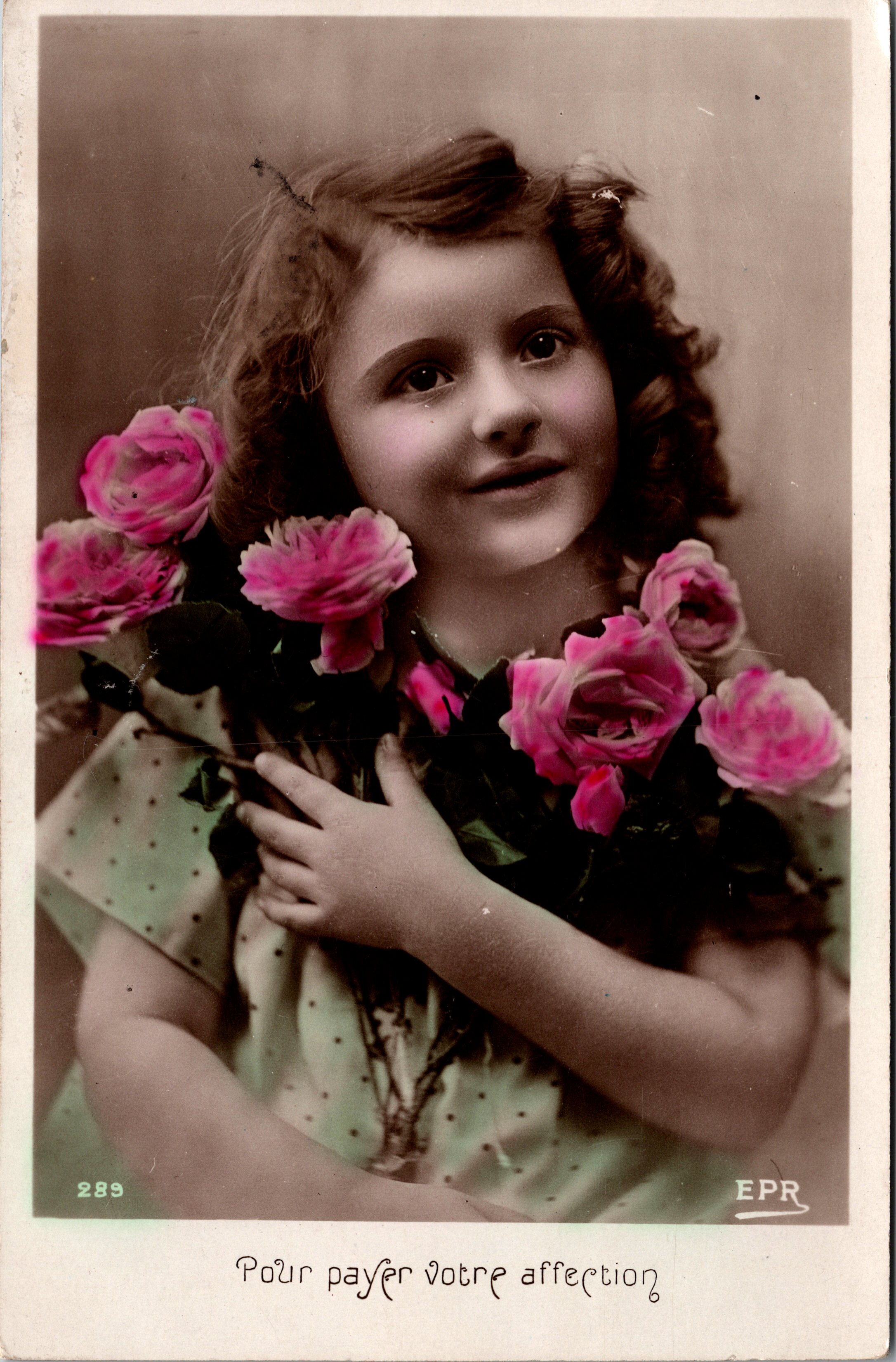 This vintage real photo postcard features an adorable little girl holding a bouquet of pink flowers. The girl is bright eyed and is flashing a beautiful smile. The French caption on the front of the card translates to “To Pay For Your Attention”. I believe that the card is a Thank-You card. The postcard was published by EPR as part of a series (No. 289). This real photo postcard is in overall good condition (see scans).